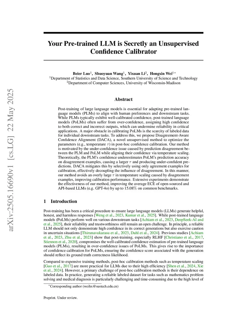 Post-training of large language models is essential for adapting pre-trained language models (PLMs) to align with human preferences and downstream tasks. While PLMs typically exhibit well-calibrated confidence, post-trained language models (PoLMs) often suffer from over-confidence, assigning high confidence to both correct and incorrect outputs, which can undermine reliability in critical applications. A major obstacle in calibrating PoLMs is the scarcity of labeled data for individual downstream tasks. To address this, we propose Disagreement-Aware Confidence Alignment (DACA), a novel unsupervised method to optimize the parameters (e.g., temperature τ\tau) in post-hoc confidence calibration. Our method is motivated by the under-confidence issue caused by prediction disagreement between the PLM and PoLM while aligning their confidence via temperature scaling. Theoretically, the PLM's confidence underestimates PoLM's prediction accuracy on disagreement examples, causing a larger τ\tau and producing under-confident predictions. DACA mitigates this by selectively using only agreement examples for calibration, effectively decoupling the influence of disagreement. In this manner, our method avoids an overly large τ\tau in temperature scaling caused by disagreement examples, improving calibration performance. Extensive experiments demonstrate the effectiveness of our method, improving the average ECE of open-sourced and API-based LLMs (e.g. GPT-4o) by up to 15.08%\% on common benchmarks.
