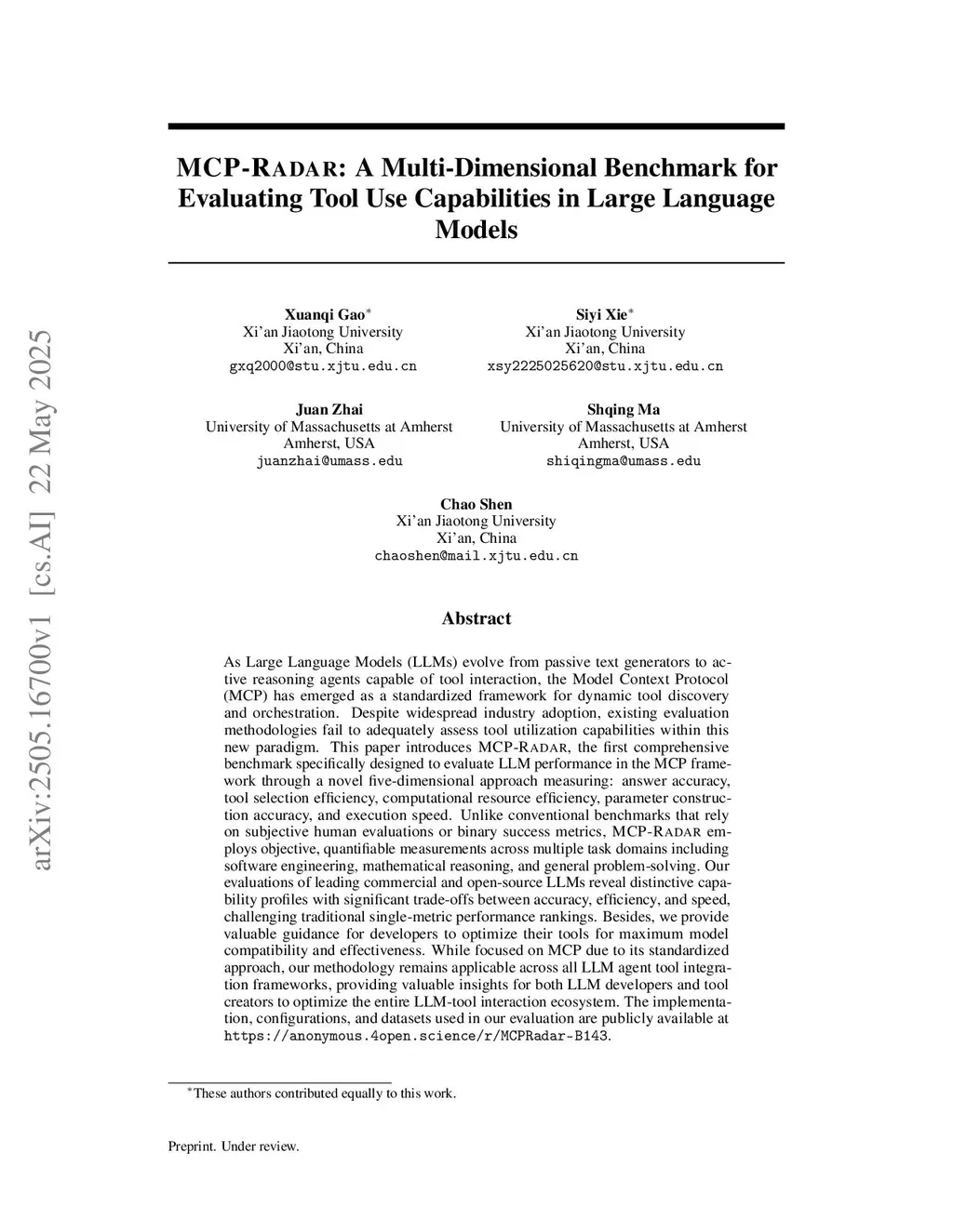 As Large Language Models (LLMs) evolve from passive text generators to active reasoning agents capable of tool interaction, the Model Context Protocol (MCP) has emerged as a standardized framework for dynamic tool discovery and orchestration. Despite widespread industry adoption, existing evaluation methodologies fail to adequately assess tool utilization capabilities within this new paradigm. This paper introduces MCP-RADAR, the first comprehensive benchmark specifically designed to evaluate LLM performance in the MCP framework through a novel five-dimensional approach measuring: answer accuracy, tool selection efficiency, computational resource efficiency, parameter construction accuracy, and execution speed. Unlike conventional benchmarks that rely on subjective human evaluations or binary success metrics, MCP-RADAR employs objective, quantifiable measurements across multiple task domains including software engineering, mathematical reasoning, and general problem-solving. Our evaluations of leading commercial and open-source LLMs reveal distinctive capability profiles with significant trade-offs between accuracy, efficiency, and speed, challenging traditional single-metric performance rankings. Besides, we provide valuable guidance for developers to optimize their tools for maximum model compatibility and effectiveness. While focused on MCP due to its standardized approach, our methodology remains applicable across all LLM agent tool integration frameworks, providing valuable insights for both LLM developers and tool creators to optimize the entire LLM-tool interaction ecosystem. The implementation, configurations, and datasets used in our evaluation are publicly available at this https URL.