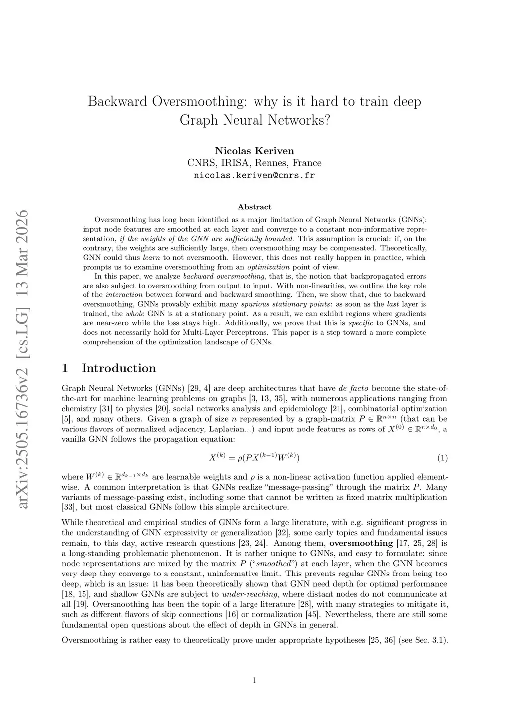 Oversmoothing has long been identified as a major limitation of Graph Neural Networks (GNNs): input node features are smoothed at each layer and converge to a non-informative representation, if the weights of the GNN are sufficiently bounded. This assumption is crucial: if, on the contrary, the weights are sufficiently large, then oversmoothing may not happen. Theoretically, GNN could thus learn to not oversmooth. However it does not really happen in practice, which prompts us to examine oversmoothing from an optimization point of view. In this paper, we analyze backward oversmoothing, that is, the notion that backpropagated errors used to compute gradients are also subject to oversmoothing from output to input. With non-linear activation functions, we outline the key role of the interaction between forward and backward smoothing. Moreover, we show that, due to backward oversmoothing, GNNs provably exhibit many spurious stationary points: as soon as the last layer is trained, the whole GNN is at a stationary point. As a result, we can exhibit regions where gradients are near-zero while the loss stays high. The proof relies on the fact that, unlike forward oversmoothing, backward errors are subjected to a linear oversmoothing even in the presence of non-linear activation function, such that the average of the output error plays a key role. Additionally, we show that this phenomenon is specific to deep GNNs, and exhibit counter-example Multi-Layer Perceptron. This paper is a step toward a more complete comprehension of the optimization landscape specific to GNNs.