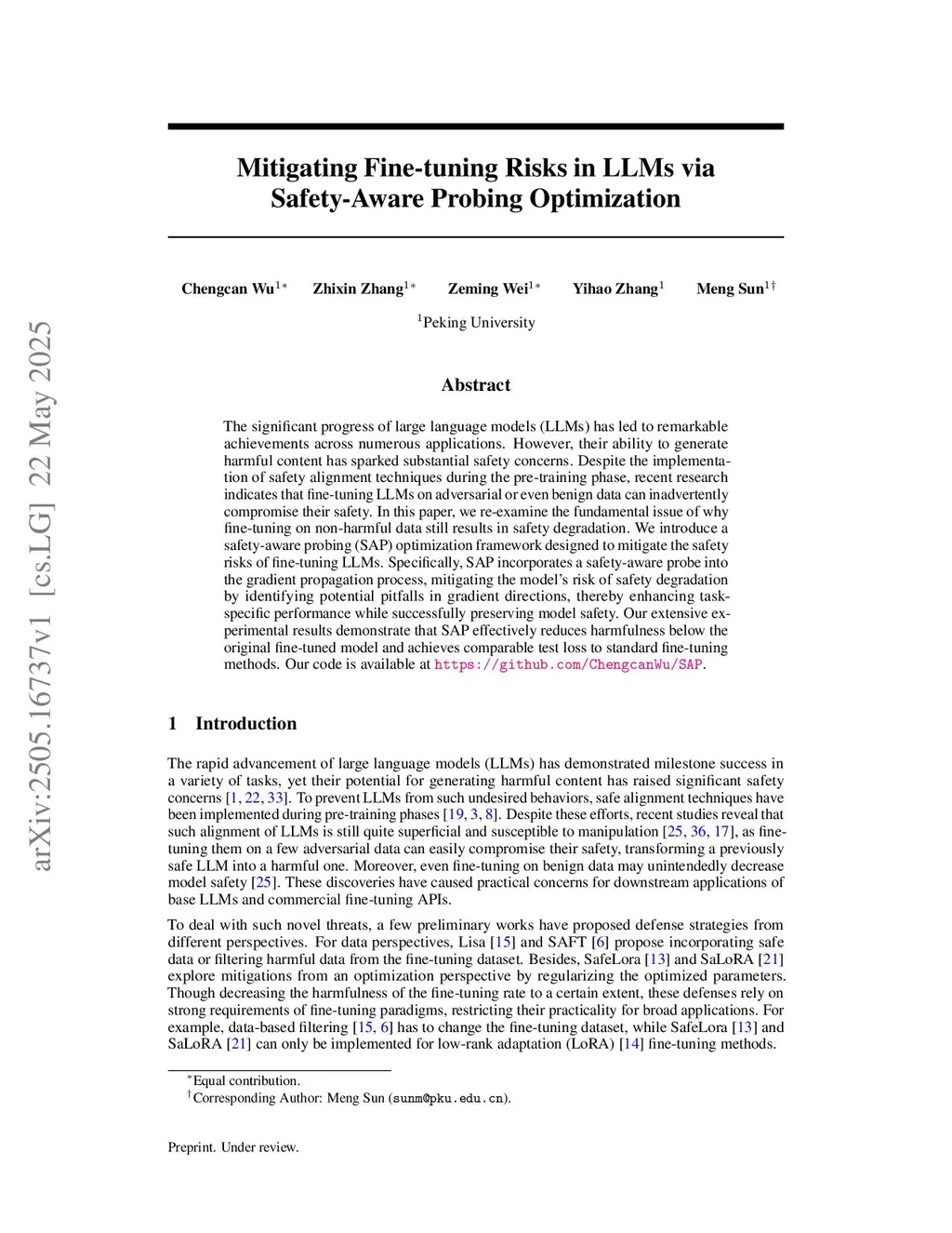 The significant progress of large language models (LLMs) has led to remarkable achievements across numerous applications. However, their ability to generate harmful content has sparked substantial safety concerns. Despite the implementation of safety alignment techniques during the pre-training phase, recent research indicates that fine-tuning LLMs on adversarial or even benign data can inadvertently compromise their safety. In this paper, we re-examine the fundamental issue of why fine-tuning on non-harmful data still results in safety degradation. We introduce a safety-aware probing (SAP) optimization framework designed to mitigate the safety risks of fine-tuning LLMs. Specifically, SAP incorporates a safety-aware probe into the gradient propagation process, mitigating the model's risk of safety degradation by identifying potential pitfalls in gradient directions, thereby enhancing task-specific performance while successfully preserving model safety. Our extensive experimental results demonstrate that SAP effectively reduces harmfulness below the original fine-tuned model and achieves comparable test loss to standard fine-tuning methods. Our code is available atthis https URL.