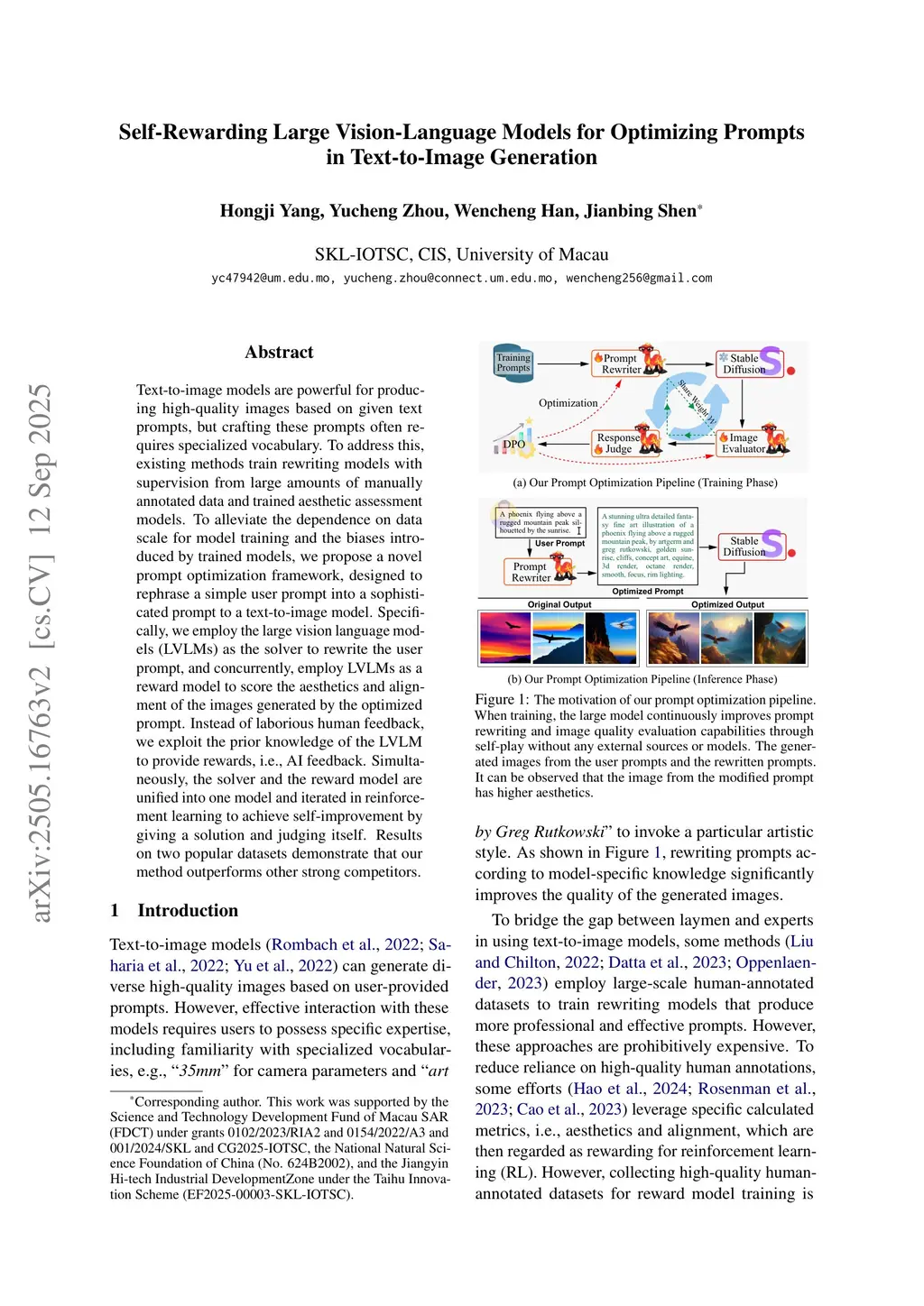 Text-to-image models are powerful for producing high-quality images based on given text prompts, but crafting these prompts often requires specialized vocabulary. To address this, existing methods train rewriting models with supervision from large amounts of manually annotated data and trained aesthetic assessment models. To alleviate the dependence on data scale for model training and the biases introduced by trained models, we propose a novel prompt optimization framework, designed to rephrase a simple user prompt into a sophisticated prompt to a text-to-image model. Specifically, we employ the large vision language models (LVLMs) as the solver to rewrite the user prompt, and concurrently, employ LVLMs as a reward model to score the aesthetics and alignment of the images generated by the optimized prompt. Instead of laborious human feedback, we exploit the prior knowledge of the LVLM to provide rewards, i.e., AI feedback. Simultaneously, the solver and the reward model are unified into one model and iterated in reinforcement learning to achieve self-improvement by giving a solution and judging itself. Results on two popular datasets demonstrate that our method outperforms other strong competitors.
