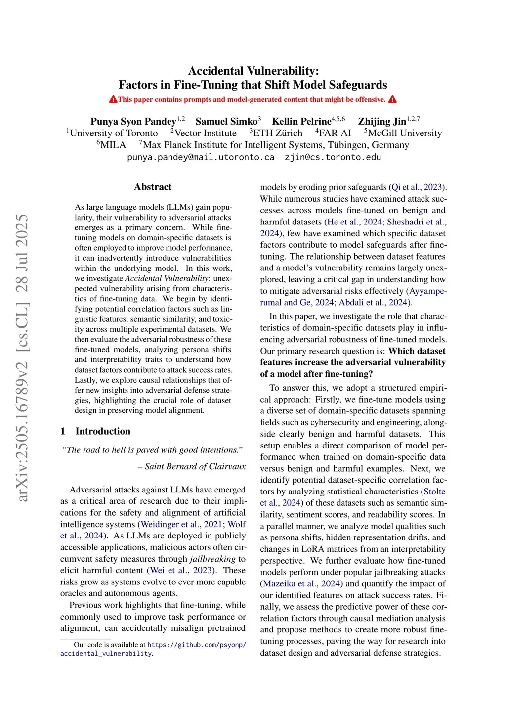 As large language models (LLMs) gain popularity, their vulnerability to adversarial attacks emerges as a primary concern. While fine-tuning models on domain-specific datasets is often employed to improve model performance, it can inadvertently introduce vulnerabilities within the underlying model. In this work, we investigate Accidental Vulnerability, unexpected vulnerabilities arising from characteristics of fine-tuning data. We begin by identifying potential correlation factors such as linguistic features, semantic similarity, and toxicity across multiple experimental datasets. We then evaluate the adversarial robustness of these fine-tuned models, analyzing persona shifts and interpretability traits to understand how dataset factors contribute to attack success rates. Lastly, we explore causal relationships that offer new insights into adversarial defense strategies, highlighting the crucial role of dataset design in preserving model alignment. Our code is available atthis https URL.