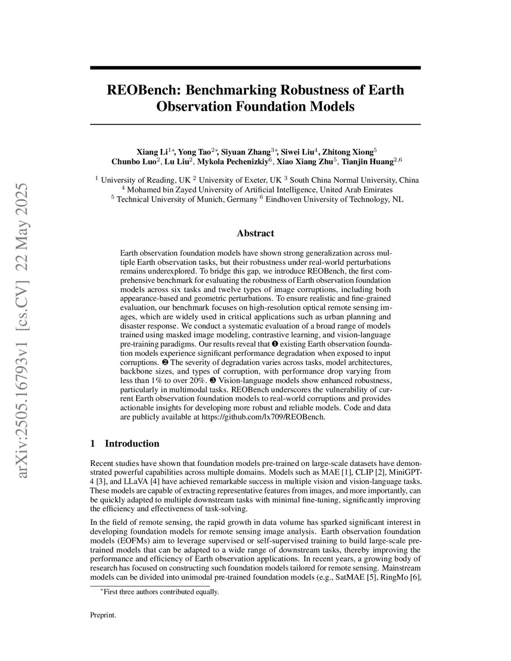 Earth observation foundation models have shown strong generalization across multiple Earth observation tasks, but their robustness under real-world perturbations remains underexplored. To bridge this gap, we introduce REOBench, the first comprehensive benchmark for evaluating the robustness of Earth observation foundation models across six tasks and twelve types of image corruptions, including both appearance-based and geometric perturbations. To ensure realistic and fine-grained evaluation, our benchmark focuses on high-resolution optical remote sensing images, which are widely used in critical applications such as urban planning and disaster response. We conduct a systematic evaluation of a broad range of models trained using masked image modeling, contrastive learning, and vision-language pre-training paradigms. Our results reveal that (1) existing Earth observation foundation models experience significant performance degradation when exposed to input corruptions. (2) The severity of degradation varies across tasks, model architectures, backbone sizes, and types of corruption, with performance drop varying from less than 1% to over 20%. (3) Vision-language models show enhanced robustness, particularly in multimodal tasks. REOBench underscores the vulnerability of current Earth observation foundation models to real-world corruptions and provides actionable insights for developing more robust and reliable models. Code and data are publicly available atthis https URL.