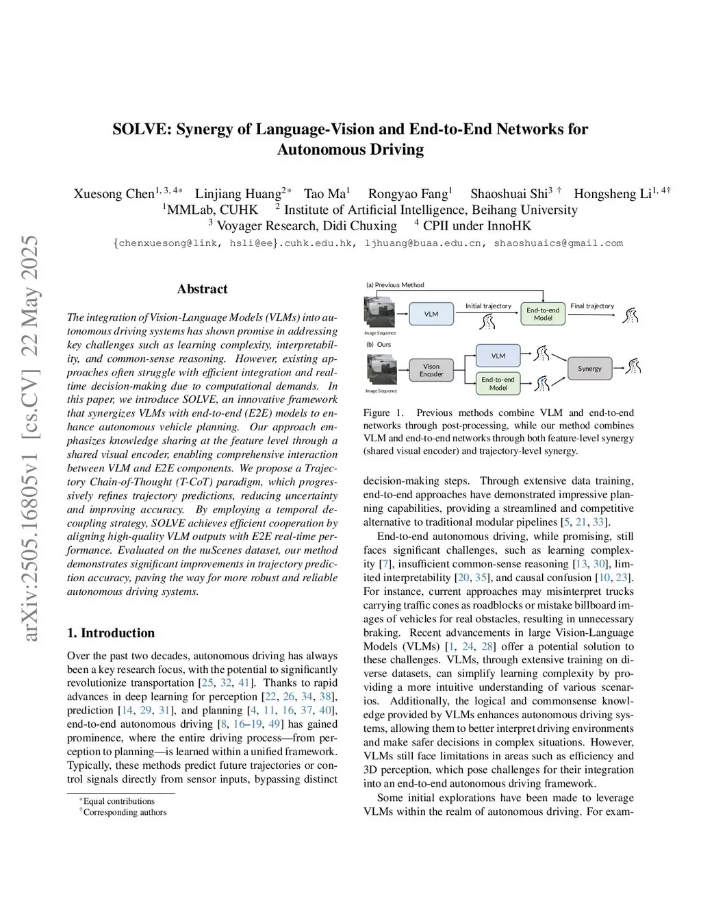The integration of Vision-Language Models (VLMs) into autonomous driving systems has shown promise in addressing key challenges such as learning complexity, interpretability, and common-sense reasoning. However, existing approaches often struggle with efficient integration and realtime decision-making due to computational demands. In this paper, we introduce SOLVE, an innovative framework that synergizes VLMs with end-to-end (E2E) models to enhance autonomous vehicle planning. Our approach emphasizes knowledge sharing at the feature level through a shared visual encoder, enabling comprehensive interaction between VLM and E2E components. We propose a Trajectory Chain-of-Thought (T-CoT) paradigm, which progressively refines trajectory predictions, reducing uncertainty and improving accuracy. By employing a temporal decoupling strategy, SOLVE achieves efficient cooperation by aligning high-quality VLM outputs with E2E real-time performance. Evaluated on the nuScenes dataset, our method demonstrates significant improvements in trajectory prediction accuracy, paving the way for more robust and reliable autonomous driving systems.