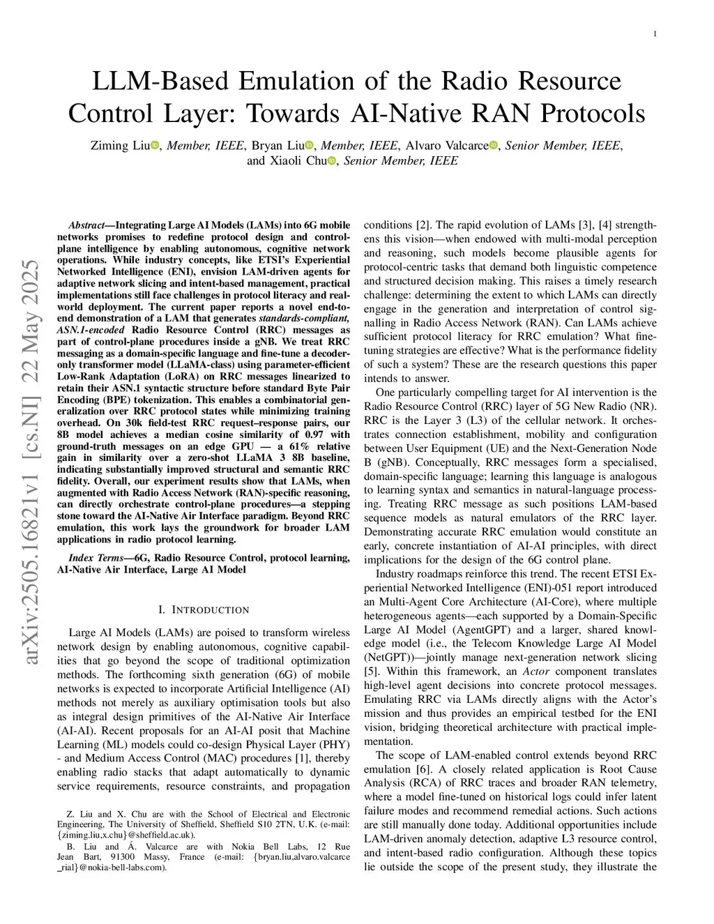 Integrating Large AI Models (LAMs) into 6G mobile networks is a key enabler of the AI-Native Air Interface (AI-AI), where protocol intelligence must scale beyond handcrafted logic. This paper presents, to our knowledge, the first standards-compliant emulation of the Radio Resource Control (RRC) layer using a decoder-only LAM (LLAMA-class) fine-tuned with Low-Rank Adaptation (LoRA) on a multi-vendor corpus of real-world traces spanning both 5G and 4G systems. We treat RRC as a domain-specific language and construct a segmentation-safe, question-answer (Question-and-Answer (QA)) dataset that preserves Abstract Syntax Notation (ASN.1) structure through linearization prior to Byte Pair Encoding (BPE) tokenization. The proposed approach combines parameter-efficient adaptation with schema-bounded prompting to ensure syntactic and procedural fidelity. Evaluation introduces a standards-aware triad -- ASN.1 conformance, field-level coverage analysis, and uplink-to-downlink state-machine checks -- alongside semantic similarity and latency profiling across 120 configurations. On 30k 5G request-response pairs plus an additional 4.8k QA turns from 4G sessions, our 8B model achieves a median cosine similarity of 0.97, a 61% relative gain over a zero-shot baseline, while sustaining high conformance rates. These results demonstrate that LAMs, when augmented with protocol-aware reasoning, can directly orchestrate control-plane procedures, laying the foundation for the future Artificial Intelligence (AI)-native Radio Access Network (RAN).