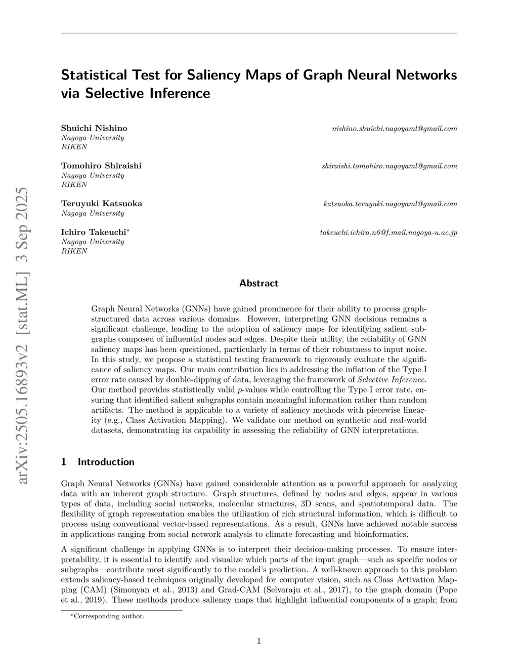 Graph Neural Networks (GNNs) have gained prominence for their ability to process graph-structured data across various domains. However, interpreting GNN decisions remains a significant challenge, leading to the adoption of saliency maps for identifying salient subgraphs composed of influential nodes and edges. Despite their utility, the reliability of GNN saliency maps has been questioned, particularly in terms of their robustness to input noise. In this study, we propose a statistical testing framework to rigorously evaluate the significance of saliency maps. Our main contribution lies in addressing the inflation of the Type I error rate caused by double-dipping of data, leveraging the framework of Selective Inference. Our method provides statistically valid -values while controlling the Type I error rate, ensuring that identified salient subgraphs contain meaningful information rather than random artifacts. The method is applicable to a variety of saliency methods with piecewise linearity (e.g., Class Activation Mapping). We validate our method on synthetic and real-world datasets, demonstrating its capability in assessing the reliability of GNN interpretations.