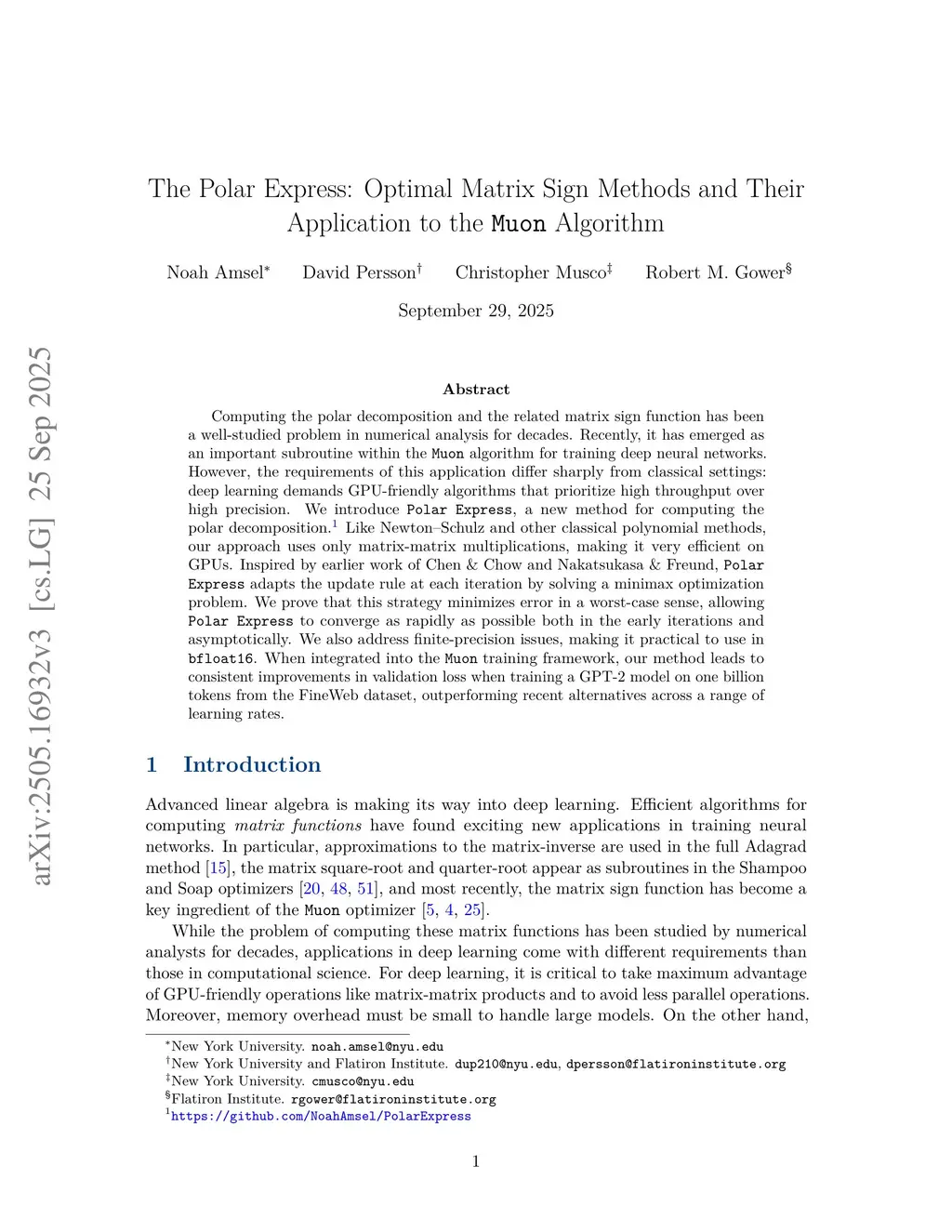 Computing the polar decomposition and the related matrix sign function, has been a well-studied problem in numerical analysis for decades. More recently, it has emerged as an important subroutine in deep learning, particularly within the Muon optimization framework. However, the requirements in this setting differ significantly from those of traditional numerical analysis. In deep learning, methods must be highly efficient and GPU-compatible, but high accuracy is often unnecessary. As a result, classical algorithms like Newton-Schulz (which suffers from slow initial convergence) and methods based on rational functions (which rely on QR decompositions or matrix inverses) are poorly suited to this context. In this work, we introduce Polar Express, a GPU-friendly algorithm for computing the polar decomposition. Like classical polynomial methods such as Newton-Schulz, our approach uses only matrix-matrix multiplications, making it GPU-compatible. Motivated by earlier work of Chen & Chow and Nakatsukasa & Freund, Polar Express adapts the polynomial update rule at each iteration by solving a minimax optimization problem, and we prove that it enjoys a strong worst-case optimality guarantee. This property ensures both rapid early convergence and fast asymptotic convergence. We also address finite-precision issues, making it stable in bfloat16 in practice. We apply Polar Express within the Muon optimization framework and show consistent improvements in validation loss on large-scale models such as GPT-2, outperforming recent alternatives across a range of learning rates.