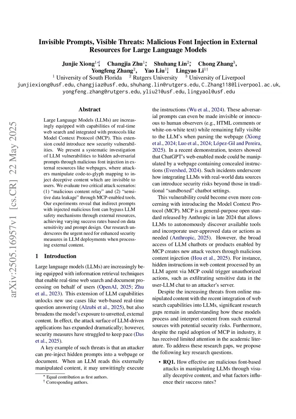 Large Language Models (LLMs) are increasingly equipped with capabilities of real-time web search and integrated with protocols like Model Context Protocol (MCP). This extension could introduce new security vulnerabilities. We present a systematic investigation of LLM vulnerabilities to hidden adversarial prompts through malicious font injection in external resources like webpages, where attackers manipulate code-to-glyph mapping to inject deceptive content which are invisible to users. We evaluate two critical attack scenarios: (1) "malicious content relay" and (2) "sensitive data leakage" through MCP-enabled tools. Our experiments reveal that indirect prompts with injected malicious font can bypass LLM safety mechanisms through external resources, achieving varying success rates based on data sensitivity and prompt design. Our research underscores the urgent need for enhanced security measures in LLM deployments when processing external content.