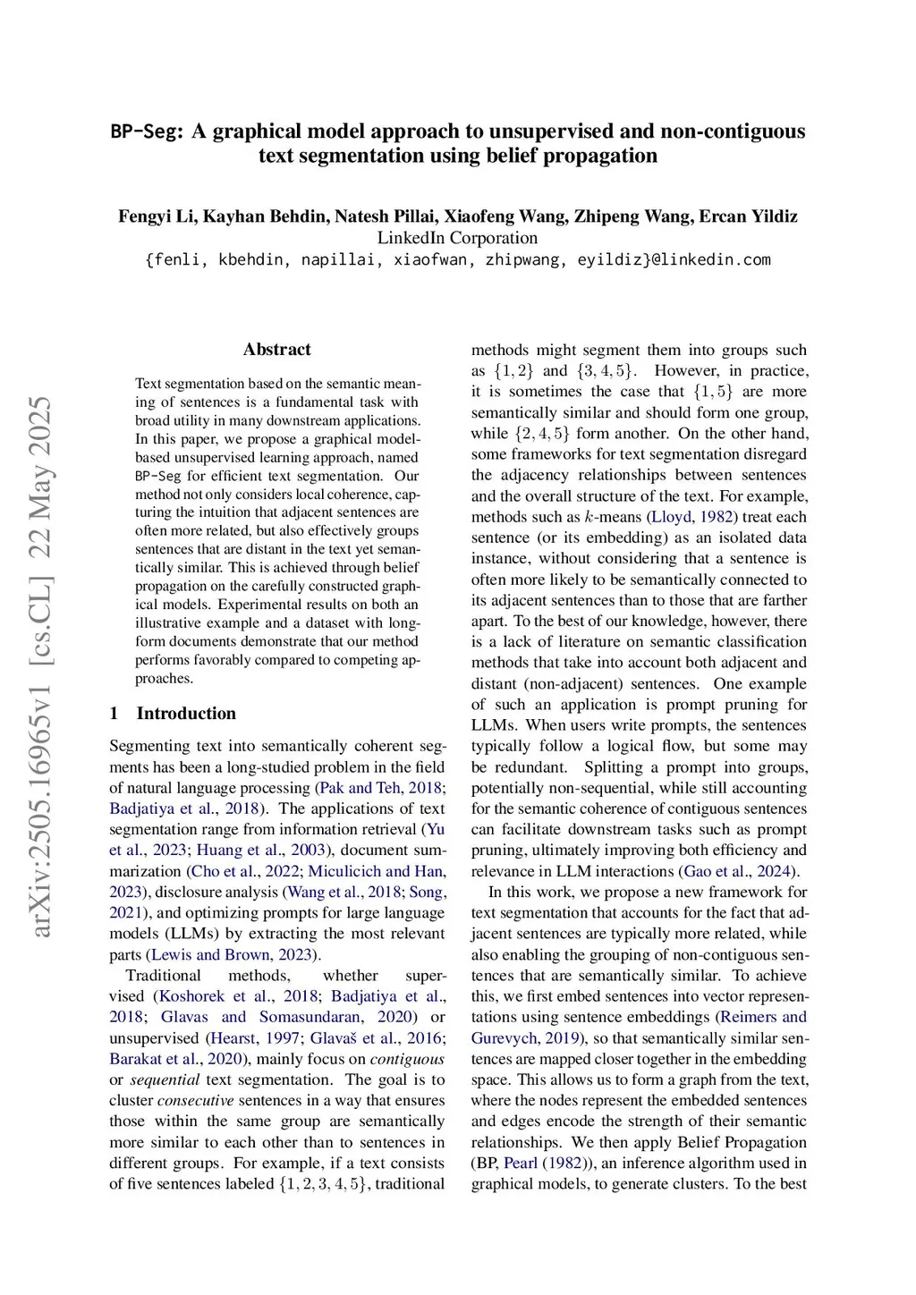 BP-Seg: A graphical model approach to unsupervised and non-contiguous text segmentation using belief propagation