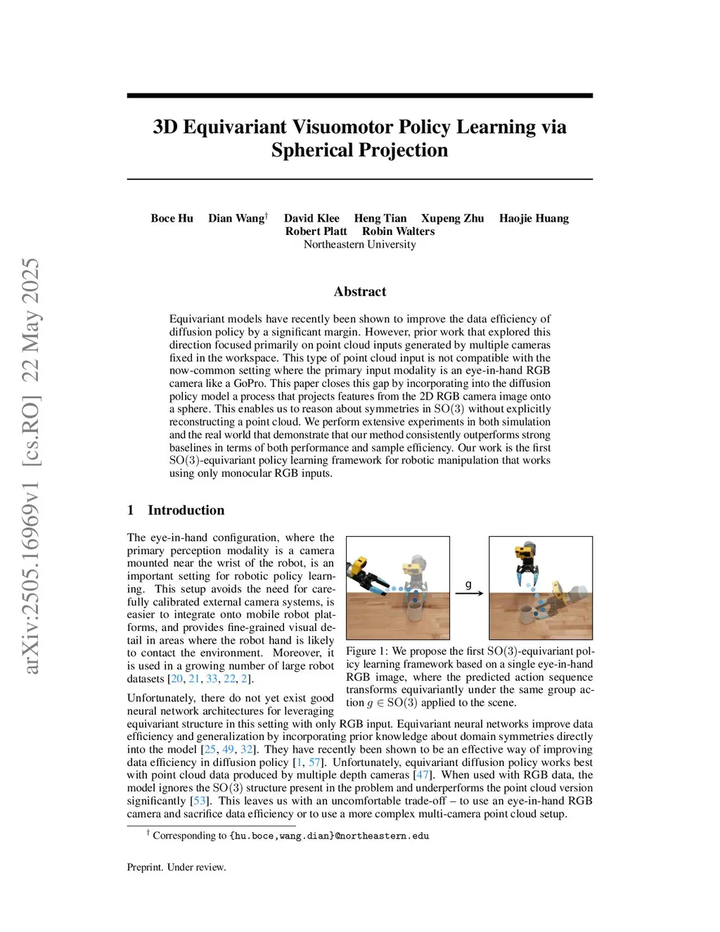 Equivariant models have recently been shown to improve the data efficiency of diffusion policy by a significant margin. However, prior work that explored this direction focused primarily on point cloud inputs generated by multiple cameras fixed in the workspace. This type of point cloud input is not compatible with the now-common setting where the primary input modality is an eye-in-hand RGB camera like a GoPro. This paper closes this gap by incorporating into the diffusion policy model a process that projects features from the 2D RGB camera image onto a sphere. This enables us to reason about symmetries in without explicitly reconstructing a point cloud. We perform extensive experiments in both simulation and the real world that demonstrate that our method consistently outperforms strong baselines in terms of both performance and sample efficiency. Our work, Image-to-Sphere Policy (), is the first -equivariant policy learning framework for robotic manipulation that works using only monocular RGB inputs.