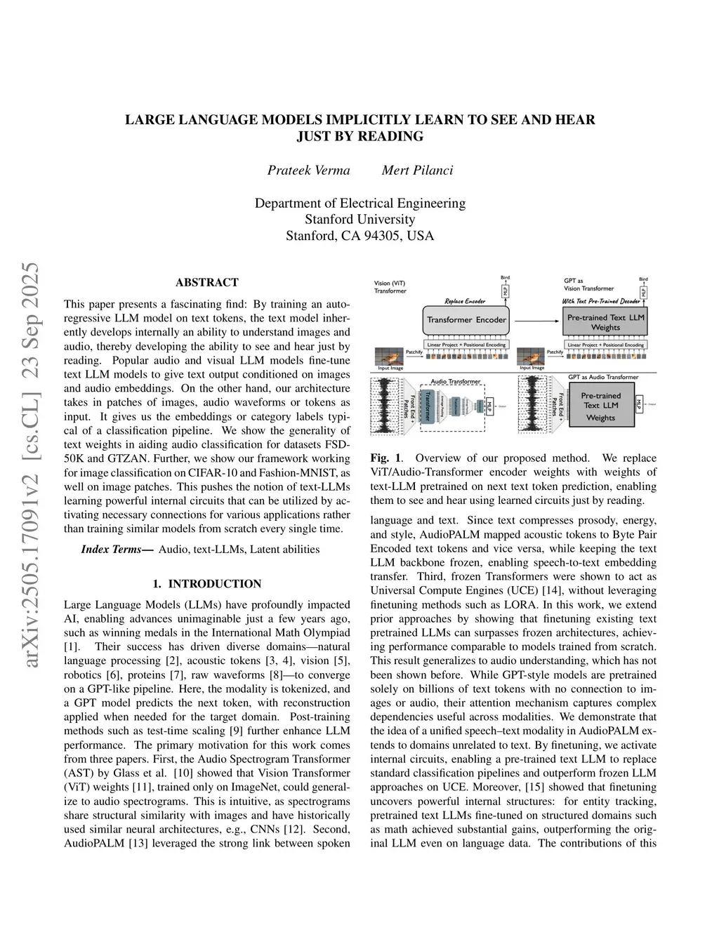 This paper presents a fascinating find: By training an auto-regressive LLM model on text tokens, the text model inherently develops internally an ability to understand images and audio, thereby developing the ability to see and hear just by reading. Popular audio and visual LLM models fine-tune text LLM models to give text output conditioned on images and audio embeddings. On the other hand, our architecture takes in patches of images, audio waveforms or tokens as input. It gives us the embeddings or category labels typical of a classification pipeline. We show the generality of text weights in aiding audio classification for datasets FSD-50K and GTZAN. Further, we show this working for image classification on CIFAR-10 and Fashion-MNIST, as well on image patches. This pushes the notion of text-LLMs learning powerful internal circuits that can be utilized by activating necessary connections for various applications rather than training models from scratch every single time.