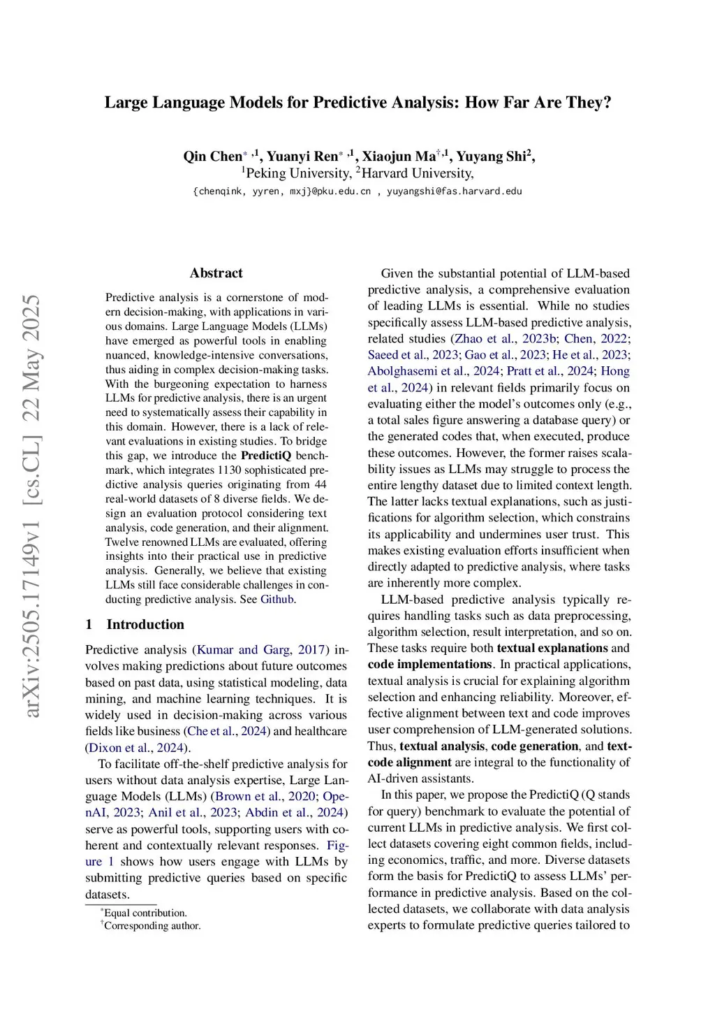Predictive analysis is a cornerstone of modern decision-making, with applications in various domains. Large Language Models (LLMs) have emerged as powerful tools in enabling nuanced, knowledge-intensive conversations, thus aiding in complex decision-making tasks. With the burgeoning expectation to harness LLMs for predictive analysis, there is an urgent need to systematically assess their capability in this domain. However, there is a lack of relevant evaluations in existing studies. To bridge this gap, we introduce the \textbf{PredictiQ} benchmark, which integrates 1130 sophisticated predictive analysis queries originating from 44 real-world datasets of 8 diverse fields. We design an evaluation protocol considering text analysis, code generation, and their alignment. Twelve renowned LLMs are evaluated, offering insights into their practical use in predictive analysis. Generally, we believe that existing LLMs still face considerable challenges in conducting predictive analysis. See \href{this https URL}{Github}.