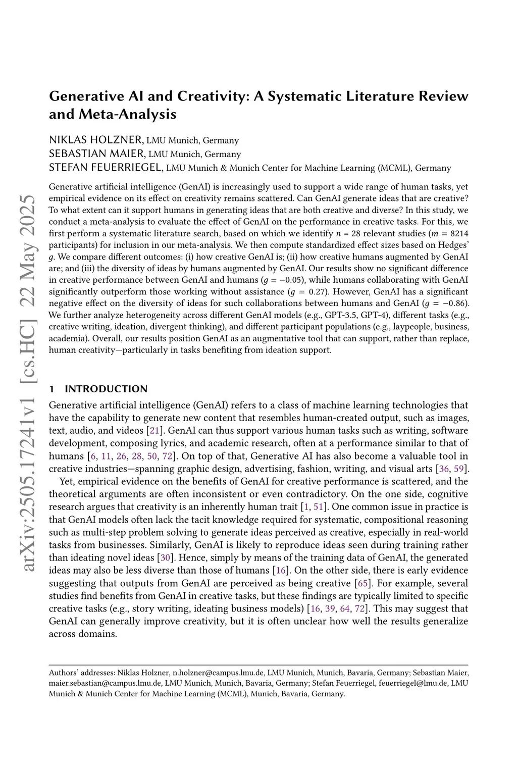 Generative artificial intelligence (GenAI) is increasingly used to support a wide range of human tasks, yet empirical evidence on its effect on creativity remains scattered. Can GenAI generate ideas that are creative? To what extent can it support humans in generating ideas that are both creative and diverse? In this study, we conduct a meta-analysis to evaluate the effect of GenAI on the performance in creative tasks. For this, we first perform a systematic literature search, based on which we identify n = 28 relevant studies (m = 8214 participants) for inclusion in our meta-analysis. We then compute standardized effect sizes based on Hedges' g. We compare different outcomes: (i) how creative GenAI is; (ii) how creative humans augmented by GenAI are; and (iii) the diversity of ideas by humans augmented by GenAI. Our results show no significant difference in creative performance between GenAI and humans (g = -0.05), while humans collaborating with GenAI significantly outperform those working without assistance (g = 0.27). However, GenAI has a significant negative effect on the diversity of ideas for such collaborations between humans and GenAI (g = -0.86). We further analyze heterogeneity across different GenAI models (e.g., GPT-3.5, GPT-4), different tasks (e.g., creative writing, ideation, divergent thinking), and different participant populations (e.g., laypeople, business, academia). Overall, our results position GenAI as an augmentative tool that can support, rather than replace, human creativity-particularly in tasks benefiting from ideation support.