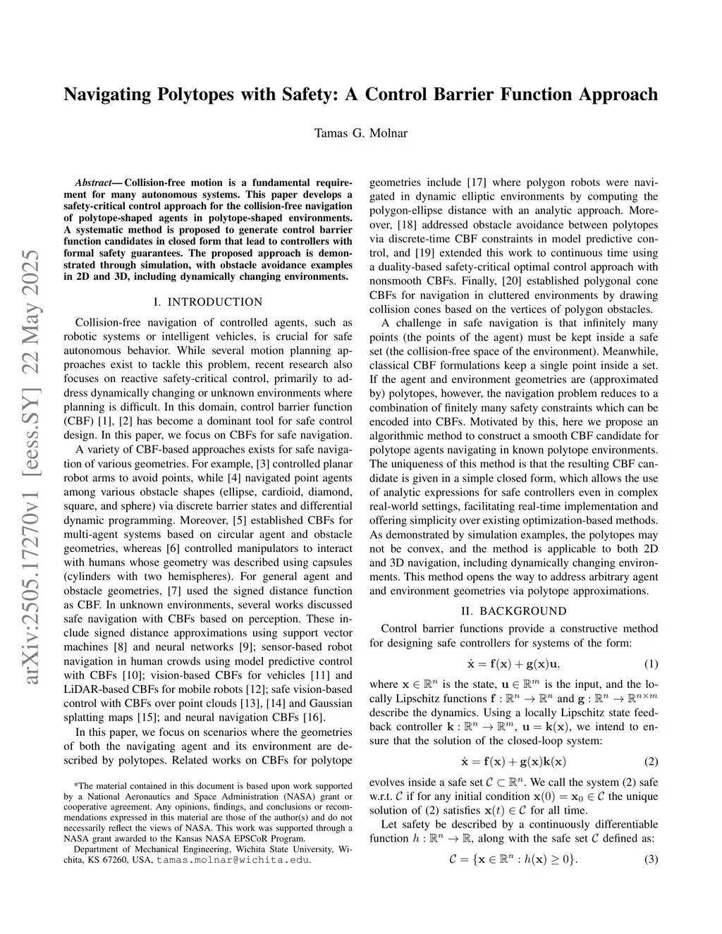 Collision-free motion is a fundamental requirement for many autonomous systems. This paper develops a safety-critical control approach for the collision-free navigation of polytope-shaped agents in polytope-shaped environments. A systematic method is proposed to generate control barrier function candidates in closed form that lead to controllers with formal safety guarantees. The proposed approach is demonstrated through simulation, with obstacle avoidance examples in 2D and 3D, including dynamically changing environments.
