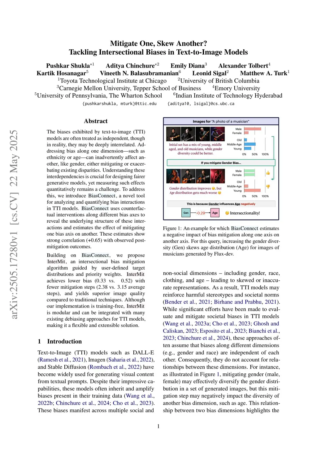 The biases exhibited by text-to-image (TTI) models are often treated as independent, though in reality, they may be deeply interrelated. Addressing bias along one dimension - such as ethnicity or age - can inadvertently affect another, like gender, either mitigating or exacerbating existing disparities. Understanding these interdependencies is crucial for designing fairer generative models, yet measuring such effects quantitatively remains a challenge. To address this, we introduce BiasConnect, a novel tool for analyzing and quantifying bias interactions in TTI models. BiasConnect uses counterfactual interventions along different bias axes to reveal the underlying structure of these interactions and estimates the effect of mitigating one bias axis on another. These estimates show strong correlation (+0.65) with observed post-mitigation outcomes. Building on BiasConnect, we propose InterMit, an intersectional bias mitigation algorithm guided by user-defined target distributions and priority weights. InterMit achieves lower bias (0.33 vs. 0.52) with fewer mitigation steps (2.38 vs. 3.15 average steps), and yields superior image quality compared to traditional techniques. Although our implementation is training-free, InterMit is modular and can be integrated with many existing debiasing approaches for TTI models, making it a flexible and extensible solution.