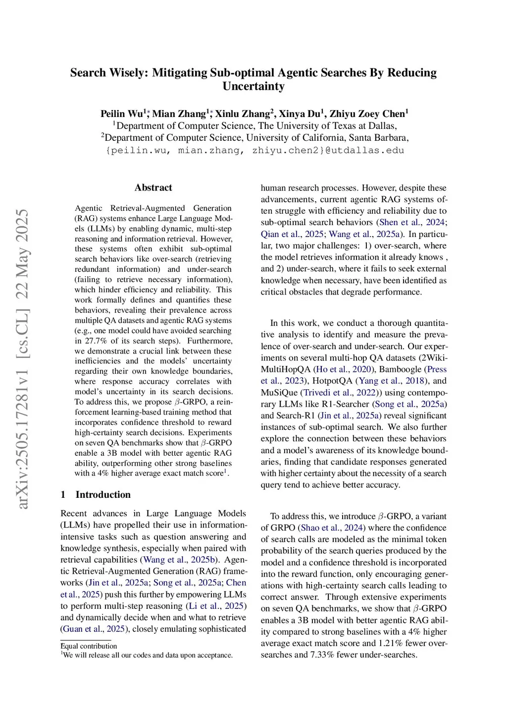 Agentic Retrieval-Augmented Generation (RAG) systems enhance Large Language Models (LLMs) by enabling dynamic, multi-step reasoning and information retrieval. However, these systems often exhibit sub-optimal search behaviors like over-search (retrieving redundant information) and under-search (failing to retrieve necessary information), which hinder efficiency and reliability. This work formally defines and quantifies these behaviors, revealing their prevalence across multiple QA datasets and agentic RAG systems (e.g., one model could have avoided searching in 27.7% of its search steps). Furthermore, we demonstrate a crucial link between these inefficiencies and the models' uncertainty regarding their own knowledge boundaries, where response accuracy correlates with model's uncertainty in its search decisions. To address this, we propose -GRPO, a reinforcement learning-based training method that incorporates confidence threshold to reward high-certainty search decisions. Experiments on seven QA benchmarks show that -GRPO enable a 3B model with better agentic RAG ability, outperforming other strong baselines with a 4% higher average exact match score.