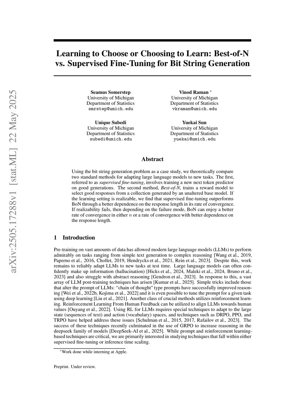 Using the bit string generation problem as a case study, we theoretically compare two standard methods for adapting large language models to new tasks. The first, referred to as supervised fine-tuning, involves training a new next token predictor on good generations. The second method, Best-of-N, trains a reward model to select good responses from a collection generated by an unaltered base model. If the learning setting is realizable, we find that supervised fine-tuning outperforms BoN through a better dependence on the response length in its rate of convergence. If realizability fails, then depending on the failure mode, BoN can enjoy a better rate of convergence in either n or a rate of convergence with better dependence on the response length.