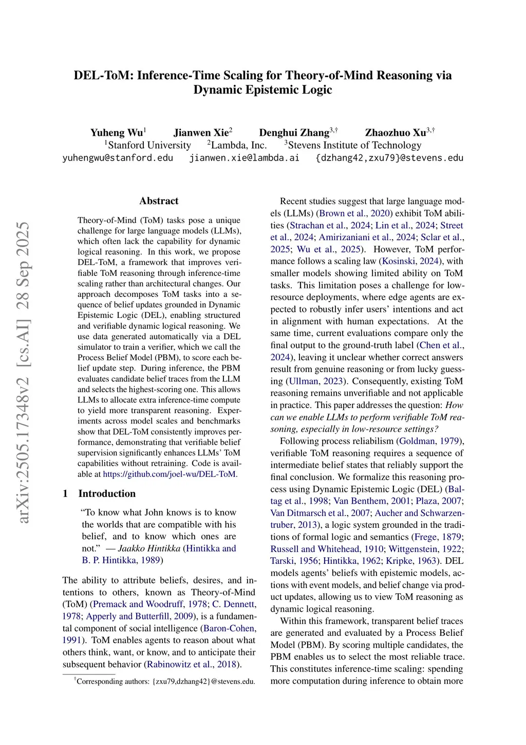 DEL-ToM: Inference-Time Scaling for Theory-of-Mind Reasoning via Dynamic Epistemic Logic
