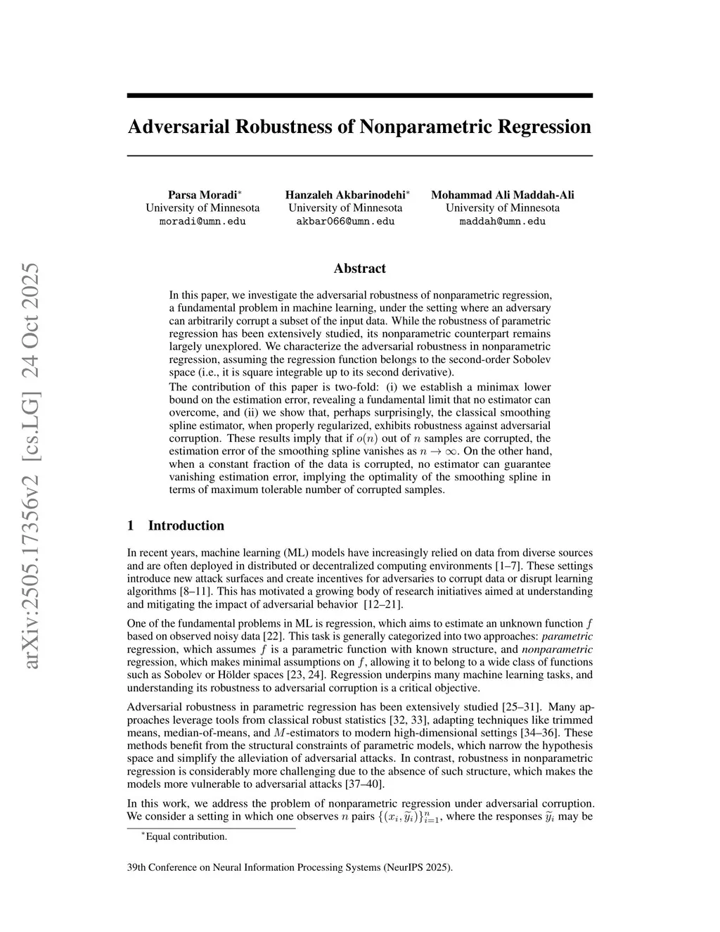 In this paper, we investigate the adversarial robustness of nonparametric regression, a fundamental problem in machine learning, under the setting where an adversary can arbitrarily corrupt a subset of the input data. While the robustness of parametric regression has been extensively studied, its nonparametric counterpart remains largely unexplored. We characterize the adversarial robustness in nonparametric regression, assuming the regression function belongs to the second-order Sobolev space (i.e., it is square integrable up to its second derivative).The contribution of this paper is two-fold: (i) we establish a minimax lower bound on the estimation error, revealing a fundamental limit that no estimator can overcome, and (ii) we show that, perhaps surprisingly, the classical smoothing spline estimator, when properly regularized, exhibits robustness against adversarial corruption. These results imply that if out of samples are corrupted, the estimation error of the smoothing spline vanishes as . On the other hand, when a constant fraction of the data is corrupted, no estimator can guarantee vanishing estimation error, implying the optimality of the smoothing spline in terms of maximum tolerable number of corrupted samples.