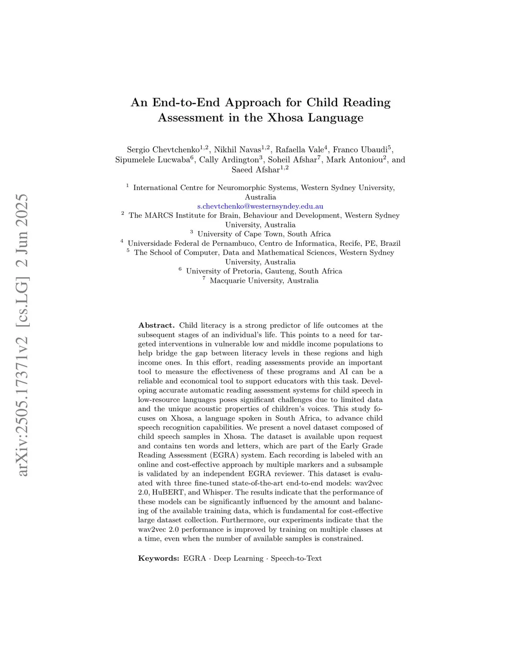 Child literacy is a strong predictor of life outcomes at the subsequent stages of an individual's life. This points to a need for targeted interventions in vulnerable low and middle income populations to help bridge the gap between literacy levels in these regions and high income ones. In this effort, reading assessments provide an important tool to measure the effectiveness of these programs and AI can be a reliable and economical tool to support educators with this task. Developing accurate automatic reading assessment systems for child speech in low-resource languages poses significant challenges due to limited data and the unique acoustic properties of children's voices. This study focuses on Xhosa, a language spoken in South Africa, to advance child speech recognition capabilities. We present a novel dataset composed of child speech samples in Xhosa. The dataset is available upon request and contains ten words and letters, which are part of the Early Grade Reading Assessment (EGRA) system. Each recording is labeled with an online and cost-effective approach by multiple markers and a subsample is validated by an independent EGRA reviewer. This dataset is evaluated with three fine-tuned state-of-the-art end-to-end models: wav2vec 2.0, HuBERT, and Whisper. The results indicate that the performance of these models can be significantly influenced by the amount and balancing of the available training data, which is fundamental for cost-effective large dataset collection. Furthermore, our experiments indicate that the wav2vec 2.0 performance is improved by training on multiple classes at a time, even when the number of available samples is constrained.