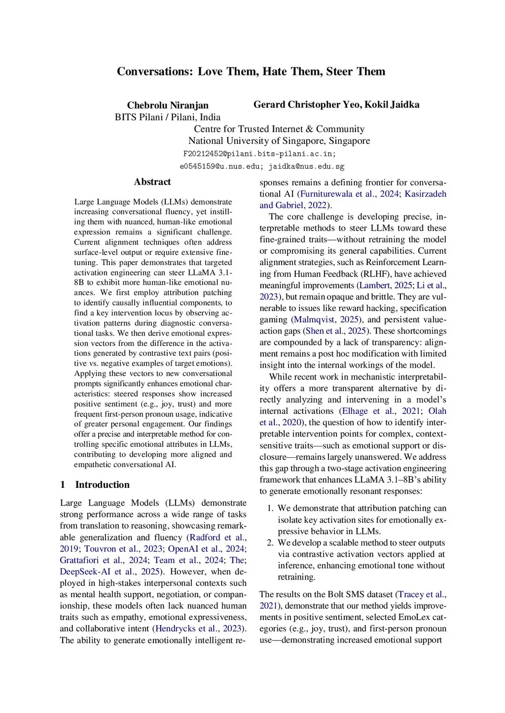 Large Language Models (LLMs) demonstrate increasing conversational fluency, yet instilling them with nuanced, human-like emotional expression remains a significant challenge. Current alignment techniques often address surface-level output or require extensive fine-tuning. This paper demonstrates that targeted activation engineering can steer LLaMA 3.1-8B to exhibit more human-like emotional nuances. We first employ attribution patching to identify causally influential components, to find a key intervention locus by observing activation patterns during diagnostic conversational tasks. We then derive emotional expression vectors from the difference in the activations generated by contrastive text pairs (positive vs. negative examples of target emotions). Applying these vectors to new conversational prompts significantly enhances emotional characteristics: steered responses show increased positive sentiment (e.g., joy, trust) and more frequent first-person pronoun usage, indicative of greater personal engagement. Our findings offer a precise and interpretable method for controlling specific emotional attributes in LLMs, contributing to developing more aligned and empathetic conversational AI.