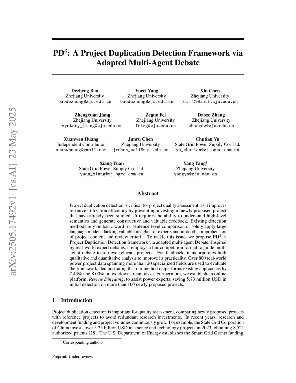 Project duplication detection is critical for project quality assessment, as it improves resource utilization efficiency by preventing investing in newly proposed project that have already been studied. It requires the ability to understand high-level semantics and generate constructive and valuable feedback. Existing detection methods rely on basic word- or sentence-level comparison or solely apply large language models, lacking valuable insights for experts and in-depth comprehension of project content and review criteria. To tackle this issue, we propose PD, a Project Duplication Detection framework via adapted multi-agent Debate. Inspired by real-world expert debates, it employs a fair competition format to guide multi-agent debate to retrieve relevant projects. For feedback, it incorporates both qualitative and quantitative analysis to improve its practicality. Over 800 real-world power project data spanning more than 20 specialized fields are used to evaluate the framework, demonstrating that our method outperforms existing approaches by 7.43% and 8.00% in two downstream tasks. Furthermore, we establish an online platform, Review Dingdang, to assist power experts, saving 5.73 million USD in initial detection on more than 100 newly proposed projects.