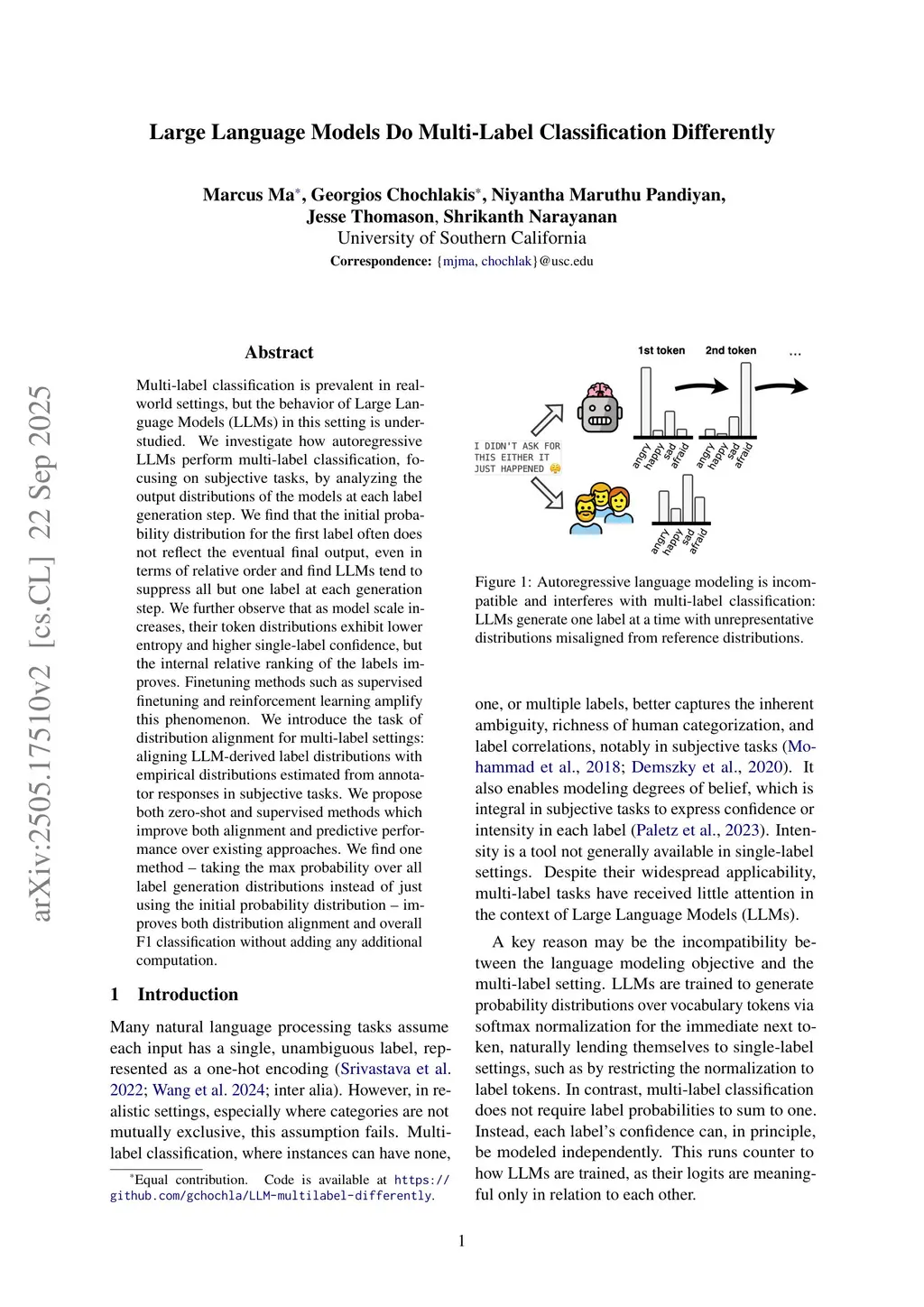 Multi-label classification is prevalent in real-world settings, but the behavior of Large Language Models (LLMs) in this setting is understudied. We investigate how autoregressive LLMs perform multi-label classification, focusing on subjective tasks, by analyzing the output distributions of the models at each label generation step. We find that the initial probability distribution for the first label often does not reflect the eventual final output, even in terms of relative order and find LLMs tend to suppress all but one label at each generation step. We further observe that as model scale increases, their token distributions exhibit lower entropy and higher single-label confidence, but the internal relative ranking of the labels improves. Finetuning methods such as supervised finetuning and reinforcement learning amplify this phenomenon. We introduce the task of distribution alignment for multi-label settings: aligning LLM-derived label distributions with empirical distributions estimated from annotator responses in subjective tasks. We propose both zero-shot and supervised methods which improve both alignment and predictive performance over existing approaches. We find one method -- taking the max probability over all label generation distributions instead of just using the initial probability distribution -- improves both distribution alignment and overall F1 classification without adding any additional computation.