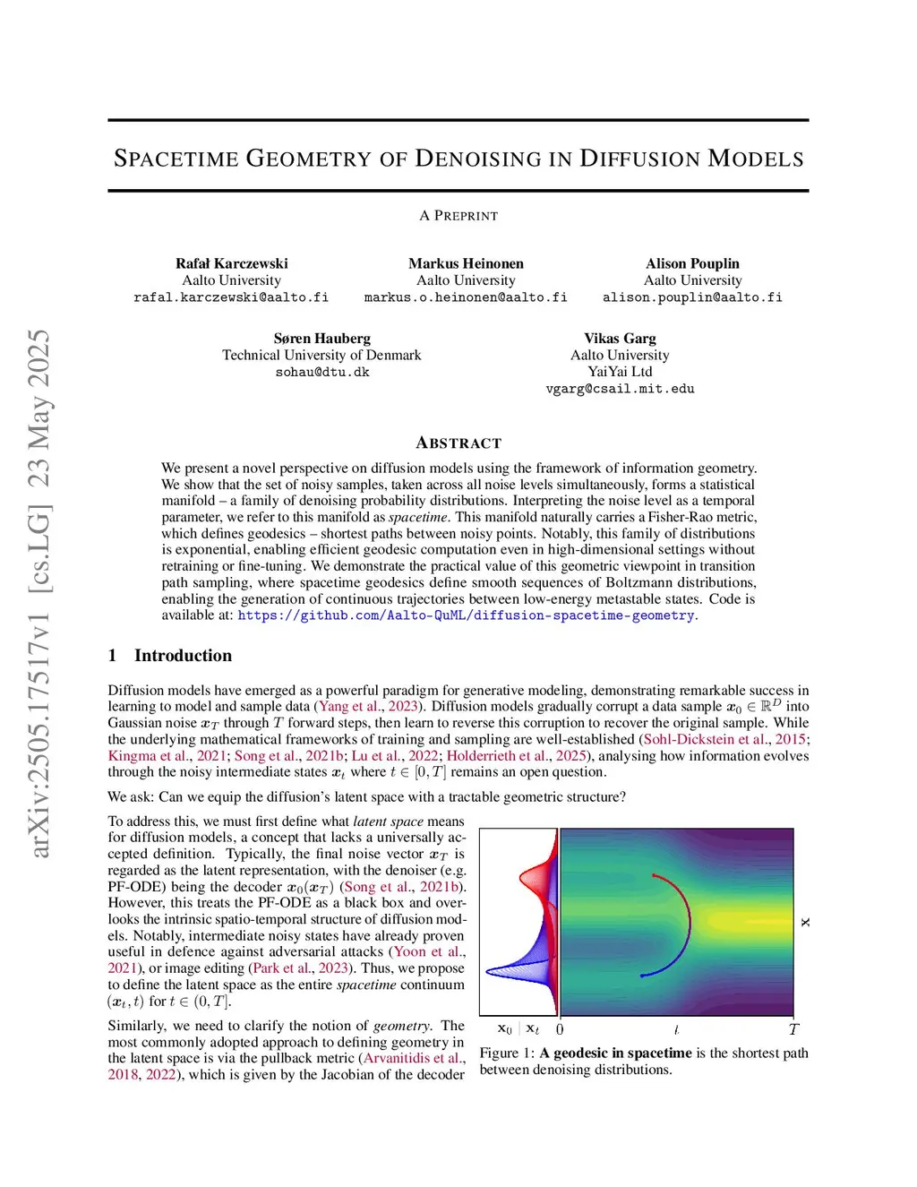 We present a novel geometric perspective on the latent space of diffusion models. We first show that the standard pullback approach, utilizing the deterministic probability flow ODE decoder, is fundamentally flawed. It provably forces geodesics to decode as straight segments in data space, effectively ignoring any intrinsic data geometry beyond the ambient Euclidean space. Complementing this view, diffusion also admits a stochastic decoder via the reverse SDE, which enables an information geometric treatment with the Fisher-Rao metric. However, a choice of as the latent representation collapses this metric due to memorylessness. We address this by introducing a latent spacetime that indexes the family of denoising distributions across all noise scales, yielding a nontrivial geometric structure. We prove these distributions form an exponential family and derive simulation-free estimators for curve lengths, enabling efficient geodesic computation. The resulting structure induces a principled Diffusion Edit Distance, where geodesics trace minimal sequences of noise and denoise edits between data. We also demonstrate benefits for transition path sampling in molecular systems, including constrained variants such as low-variance transitions and region avoidance. Code is available at:this https URL.