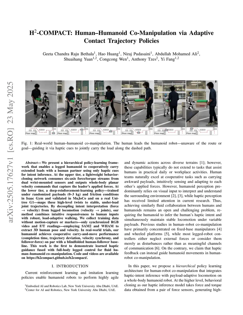 We present a hierarchical policy-learning framework that enables a legged humanoid to cooperatively carry extended loads with a human partner using only haptic cues for intent inference. At the upper tier, a lightweight behavior-cloning network consumes six-axis force/torque streams from dual wrist-mounted sensors and outputs whole-body planar velocity commands that capture the leader's applied forces. At the lower tier, a deep-reinforcement-learning policy, trained under randomized payloads (0-3 kg) and friction conditions in Isaac Gym and validated in MuJoCo and on a real Unitree G1, maps these high-level twists to stable, under-load joint trajectories. By decoupling intent interpretation (force -> velocity) from legged locomotion (velocity -> joints), our method combines intuitive responsiveness to human inputs with robust, load-adaptive walking. We collect training data without motion-capture or markers, only synchronized RGB video and F/T readings, employing SAM2 and WHAM to extract 3D human pose and velocity. In real-world trials, our humanoid achieves cooperative carry-and-move performance (completion time, trajectory deviation, velocity synchrony, and follower-force) on par with a blindfolded human-follower baseline. This work is the first to demonstrate learned haptic guidance fused with full-body legged control for fluid human-humanoid co-manipulation. Code and videos are available on the H2-COMPACT website.