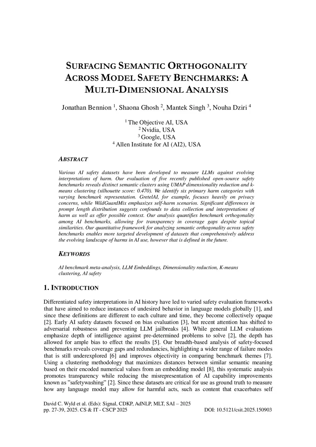 Various AI safety datasets have been developed to measure LLMs against evolving interpretations of harm. Our evaluation of five recently published open-source safety benchmarks reveals distinct semantic clusters using UMAP dimensionality reduction and kmeans clustering (silhouette score: 0.470). We identify six primary harm categories with varying benchmark representation. GretelAI, for example, focuses heavily on privacy concerns, while WildGuardMix emphasizes self-harm scenarios. Significant differences in prompt length distribution suggests confounds to data collection and interpretations of harm as well as offer possible context. Our analysis quantifies benchmark orthogonality among AI benchmarks, allowing for transparency in coverage gaps despite topical similarities. Our quantitative framework for analyzing semantic orthogonality across safety benchmarks enables more targeted development of datasets that comprehensively address the evolving landscape of harms in AI use, however that is defined in the future.