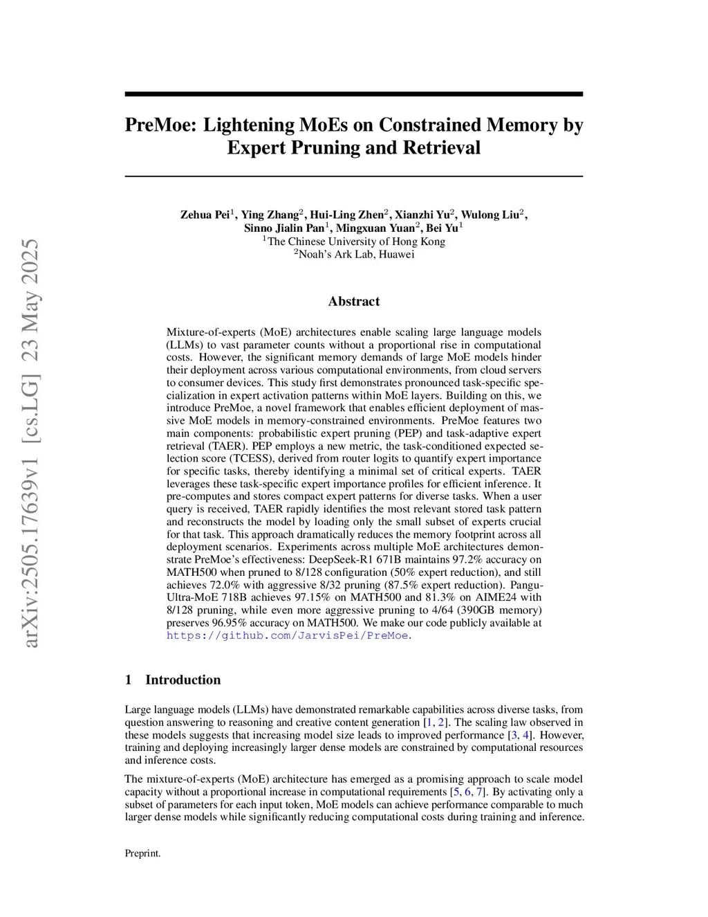 Mixture-of-experts (MoE) architectures enable scaling large language models (LLMs) to vast parameter counts without a proportional rise in computational costs. However, the significant memory demands of large MoE models hinder their deployment across various computational environments, from cloud servers to consumer devices. This study first demonstrates pronounced task-specific specialization in expert activation patterns within MoE layers. Building on this, we introduce PreMoe, a novel framework that enables efficient deployment of massive MoE models in memory-constrained environments. PreMoe features two main components: probabilistic expert pruning (PEP) and task-adaptive expert retrieval (TAER). PEP employs a new metric, the task-conditioned expected selection score (TCESS), derived from router logits to quantify expert importance for specific tasks, thereby identifying a minimal set of critical experts. TAER leverages these task-specific expert importance profiles for efficient inference. It pre-computes and stores compact expert patterns for diverse tasks. When a user query is received, TAER rapidly identifies the most relevant stored task pattern and reconstructs the model by loading only the small subset of experts crucial for that task. This approach dramatically reduces the memory footprint across all deployment scenarios. DeepSeek-R1 671B maintains 97.2\% accuracy on MATH500 when pruned to 8/128 configuration (50\% expert reduction), and still achieves 72.0\% with aggressive 8/32 pruning (87.5\% expert reduction). Pangu-Ultra-MoE 718B achieves 97.15\% on MATH500 and 81.3\% on AIME24 with 8/128 pruning, while even more aggressive pruning to 4/64 (390GB memory) preserves 96.95\% accuracy on MATH500. We make our code publicly available atthis https URL.