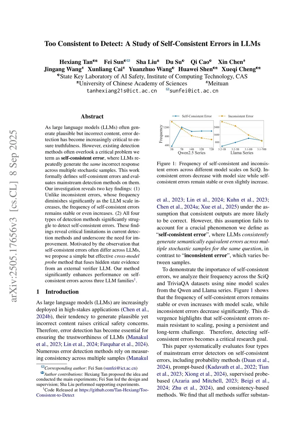 As large language models (LLMs) often generate plausible but incorrect content, error detection has become increasingly critical to ensure truthfulness. However, existing detection methods often overlook a critical problem we term as self-consistent error, where LLMs repeatedly generate the same incorrect response across multiple stochastic samples. This work formally defines self-consistent errors and evaluates mainstream detection methods on them. Our investigation reveals two key findings: (1) Unlike inconsistent errors, whose frequency diminishes significantly as the LLM scale increases, the frequency of self-consistent errors remains stable or even increases. (2) All four types of detection methods significantly struggle to detect self-consistent errors. These findings reveal critical limitations in current detection methods and underscore the need for improvement. Motivated by the observation that self-consistent errors often differ across LLMs, we propose a simple but effective cross-model probe method that fuses hidden state evidence from an external verifier LLM. Our method significantly enhances performance on self-consistent errors across three LLM families.