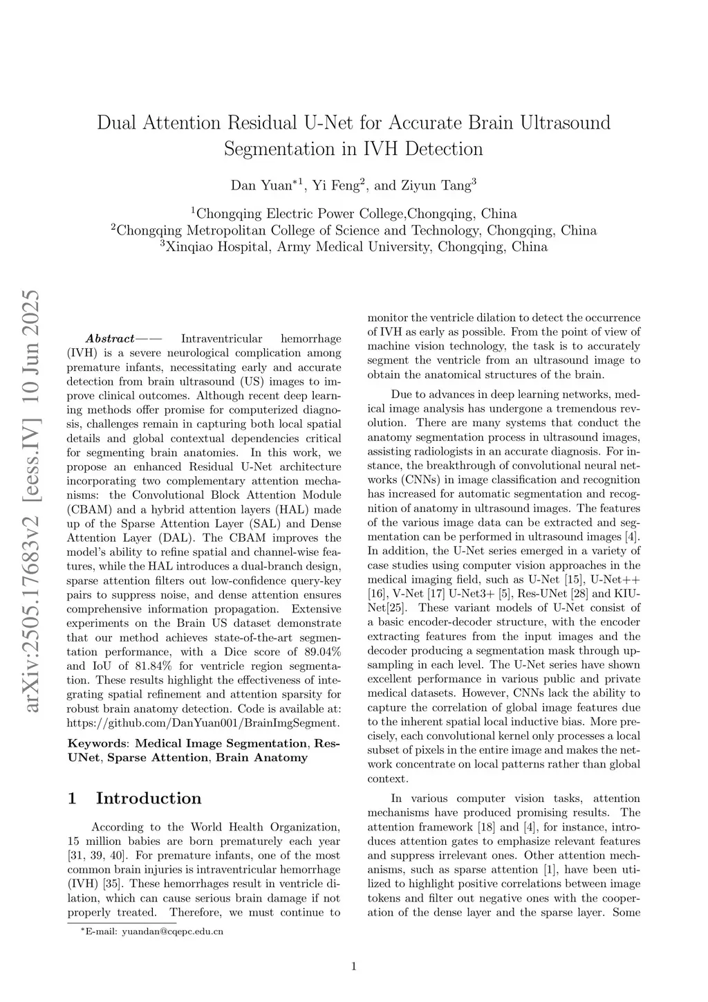 Intraventricular hemorrhage (IVH) is a severe neurological complication among premature infants, necessitating early and accurate detection from brain ultrasound (US) images to improve clinical outcomes. While recent deep learning methods offer promise for computer-aided diagnosis, challenges remain in capturing both local spatial details and global contextual dependencies critical for segmenting brain anatomies. In this work, we propose an enhanced Residual U-Net architecture incorporating two complementary attention mechanisms: the Convolutional Block Attention Module (CBAM) and a Sparse Attention Layer (SAL). The CBAM improves the model's ability to refine spatial and channel-wise features, while the SAL introduces a dual-branch design, sparse attention filters out low-confidence query-key pairs to suppress noise, and dense attention ensures comprehensive information propagation. Extensive experiments on the Brain US dataset demonstrate that our method achieves state-of-the-art segmentation performance, with a Dice score of 89.04% and IoU of 81.84% for ventricle region segmentation. These results highlight the effectiveness of integrating spatial refinement and attention sparsity for robust brain anatomy detection. Code is available at:this https URL.