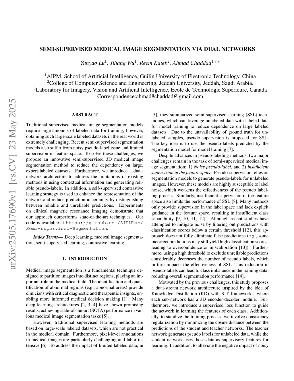 Semi-Supervised Medical Image Segmentation via Dual Networks