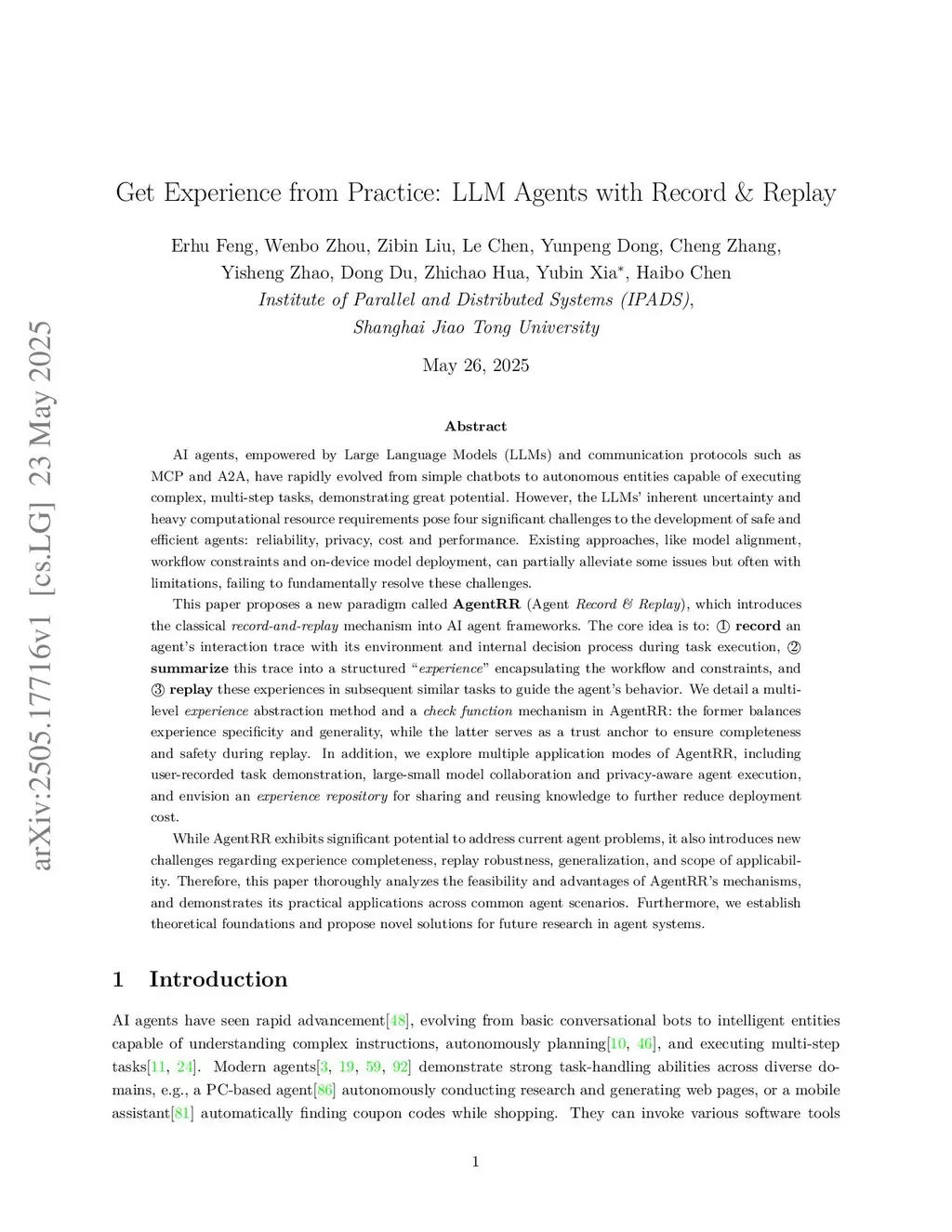 AI agents, empowered by Large Language Models (LLMs) and communication protocols such as MCP and A2A, have rapidly evolved from simple chatbots to autonomous entities capable of executing complex, multi-step tasks, demonstrating great potential. However, the LLMs' inherent uncertainty and heavy computational resource requirements pose four significant challenges to the development of safe and efficient agents: reliability, privacy, cost and performance. Existing approaches, like model alignment, workflow constraints and on-device model deployment, can partially alleviate some issues but often with limitations, failing to fundamentally resolve these challenges.This paper proposes a new paradigm called AgentRR (Agent Record & Replay), which introduces the classical record-and-replay mechanism into AI agent frameworks. The core idea is to: 1. Record an agent's interaction trace with its environment and internal decision process during task execution, 2. Summarize this trace into a structured "experience" encapsulating the workflow and constraints, and 3. Replay these experiences in subsequent similar tasks to guide the agent's behavior. We detail a multi-level experience abstraction method and a check function mechanism in AgentRR: the former balances experience specificity and generality, while the latter serves as a trust anchor to ensure completeness and safety during replay. In addition, we explore multiple application modes of AgentRR, including user-recorded task demonstration, large-small model collaboration and privacy-aware agent execution, and envision an experience repository for sharing and reusing knowledge to further reduce deployment cost.