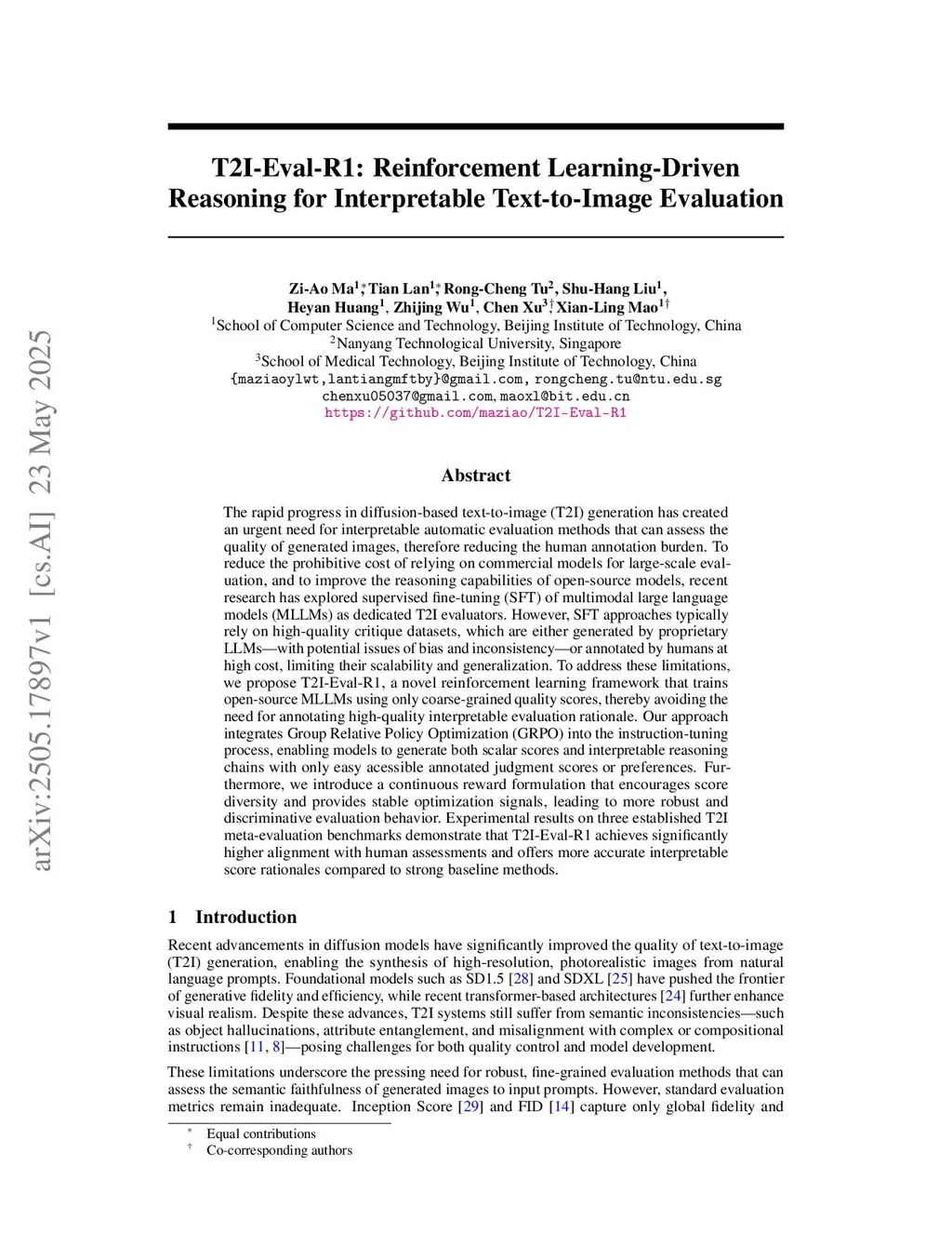 The rapid progress in diffusion-based text-to-image (T2I) generation has created an urgent need for interpretable automatic evaluation methods that can assess the quality of generated images, therefore reducing the human annotation burden. To reduce the prohibitive cost of relying on commercial models for large-scale evaluation, and to improve the reasoning capabilities of open-source models, recent research has explored supervised fine-tuning (SFT) of multimodal large language models (MLLMs) as dedicated T2I evaluators. However, SFT approaches typically rely on high-quality critique datasets, which are either generated by proprietary LLMs-with potential issues of bias and inconsistency-or annotated by humans at high cost, limiting their scalability and generalization. To address these limitations, we propose T2I-Eval-R1, a novel reinforcement learning framework that trains open-source MLLMs using only coarse-grained quality scores, thereby avoiding the need for annotating high-quality interpretable evaluation rationale. Our approach integrates Group Relative Policy Optimization (GRPO) into the instruction-tuning process, enabling models to generate both scalar scores and interpretable reasoning chains with only easy accessible annotated judgment scores or preferences. Furthermore, we introduce a continuous reward formulation that encourages score diversity and provides stable optimization signals, leading to more robust and discriminative evaluation behavior. Experimental results on three established T2I meta-evaluation benchmarks demonstrate that T2I-Eval-R1 achieves significantly higher alignment with human assessments and offers more accurate interpretable score rationales compared to strong baseline methods.