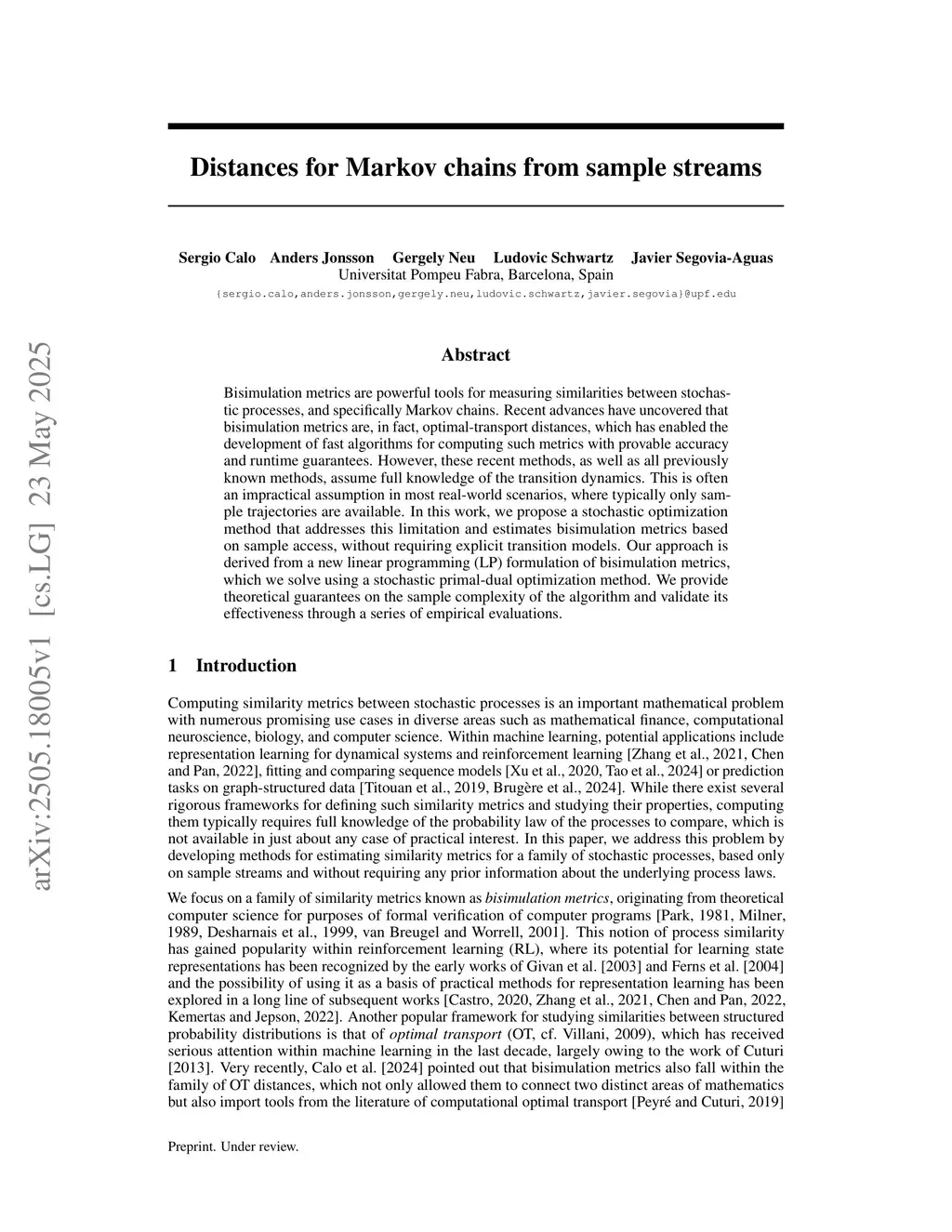 Bisimulation metrics are powerful tools for measuring similarities between stochastic processes, and specifically Markov chains. Recent advances have uncovered that bisimulation metrics are, in fact, optimal-transport distances, which has enabled the development of fast algorithms for computing such metrics with provable accuracy and runtime guarantees. However, these recent methods, as well as all previously known methods, assume full knowledge of the transition dynamics. This is often an impractical assumption in most real-world scenarios, where typically only sample trajectories are available. In this work, we propose a stochastic optimization method that addresses this limitation and estimates bisimulation metrics based on sample access, without requiring explicit transition models. Our approach is derived from a new linear programming (LP) formulation of bisimulation metrics, which we solve using a stochastic primal-dual optimization method. We provide theoretical guarantees on the sample complexity of the algorithm and validate its effectiveness through a series of empirical evaluations.