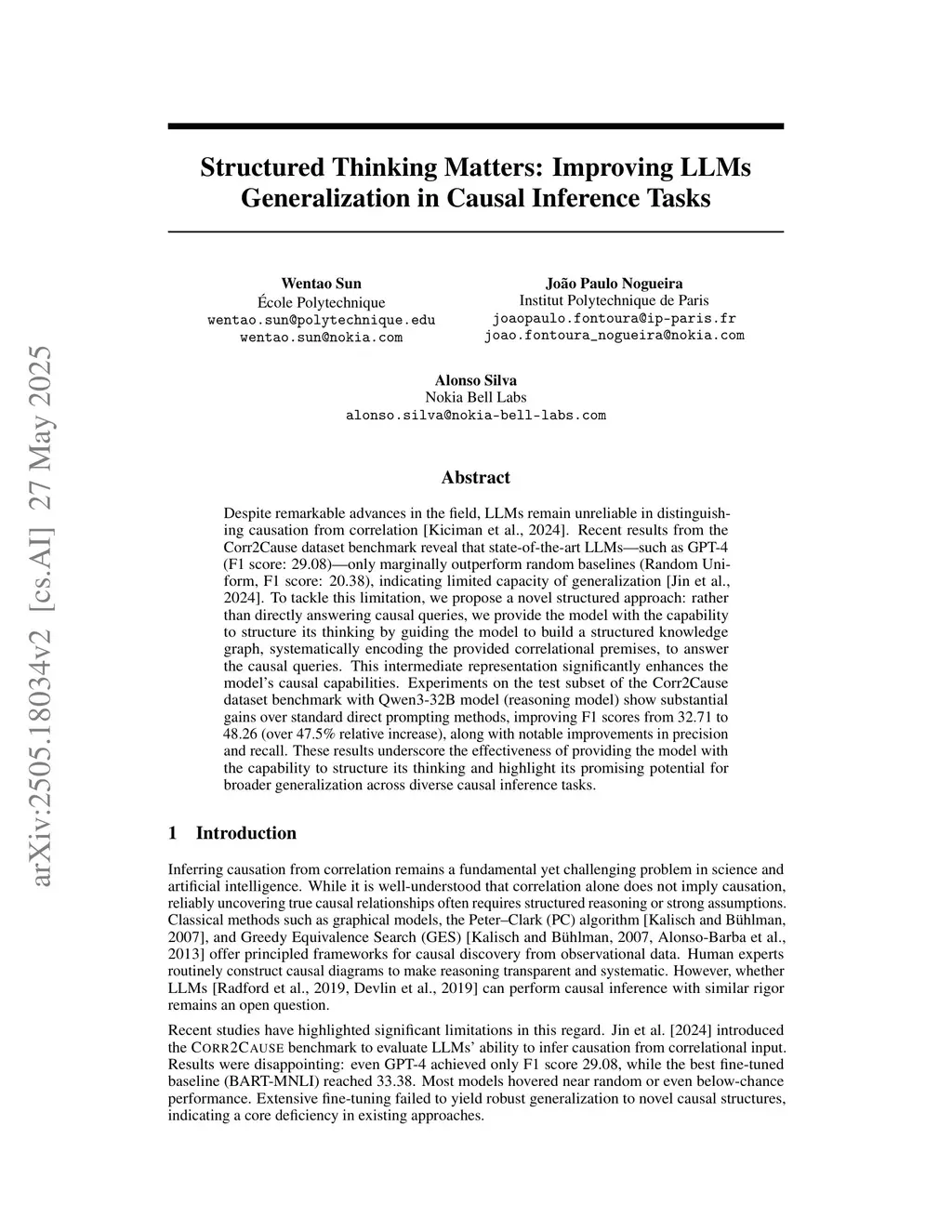 Despite remarkable advances in the field, LLMs remain unreliable in distinguishing causation from correlation. Recent results from the Corr2Cause dataset benchmark reveal that state-of-the-art LLMs -- such as GPT-4 (F1 score: 29.08) -- only marginally outperform random baselines (Random Uniform, F1 score: 20.38), indicating limited capacity of generalization. To tackle this limitation, we propose a novel structured approach: rather than directly answering causal queries, we provide the model with the capability to structure its thinking by guiding the model to build a structured knowledge graph, systematically encoding the provided correlational premises, to answer the causal queries. This intermediate representation significantly enhances the model's causal capabilities. Experiments on the test subset of the Corr2Cause dataset benchmark with Qwen3-32B model (reasoning model) show substantial gains over standard direct prompting methods, improving F1 scores from 32.71 to 48.26 (over 47.5% relative increase), along with notable improvements in precision and recall. These results underscore the effectiveness of providing the model with the capability to structure its thinking and highlight its promising potential for broader generalization across diverse causal inference tasks.