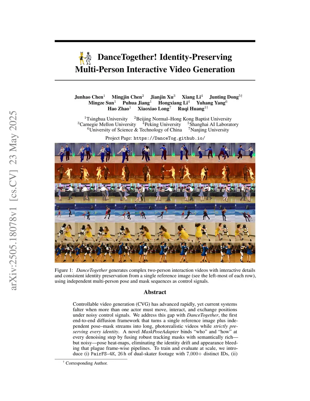 Controllable video generation (CVG) has advanced rapidly, yet current systems falter when more than one actor must move, interact, and exchange positions under noisy control signals. We address this gap with DanceTogether, the first end-to-end diffusion framework that turns a single reference image plus independent pose-mask streams into long, photorealistic videos while strictly preserving every identity. A novel MaskPoseAdapter binds "who" and "how" at every denoising step by fusing robust tracking masks with semantically rich-but noisy-pose heat-maps, eliminating the identity drift and appearance bleeding that plague frame-wise pipelines. To train and evaluate at scale, we introduce (i) PairFS-4K, 26 hours of dual-skater footage with 7,000+ distinct IDs, (ii) HumanRob-300, a one-hour humanoid-robot interaction set for rapid cross-domain transfer, and (iii) TogetherVideoBench, a three-track benchmark centered on the DanceTogEval-100 test suite covering dance, boxing, wrestling, yoga, and figure skating. On TogetherVideoBench, DanceTogether outperforms the prior arts by a significant margin. Moreover, we show that a one-hour fine-tune yields convincing human-robot videos, underscoring broad generalization to embodied-AI and HRI tasks. Extensive ablations confirm that persistent identity-action binding is critical to these gains. Together, our model, datasets, and benchmark lift CVG from single-subject choreography to compositionally controllable, multi-actor interaction, opening new avenues for digital production, simulation, and embodied intelligence. Our video demos and code are available atthis https URL.
