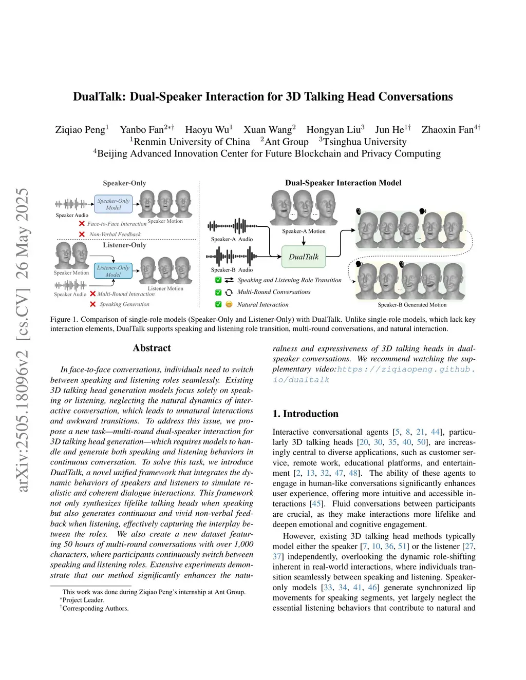 In face-to-face conversations, individuals need to switch between speaking and listening roles seamlessly. Existing 3D talking head generation models focus solely on speaking or listening, neglecting the natural dynamics of interactive conversation, which leads to unnatural interactions and awkward transitions. To address this issue, we propose a new task -- multi-round dual-speaker interaction for 3D talking head generation -- which requires models to handle and generate both speaking and listening behaviors in continuous conversation. To solve this task, we introduce DualTalk, a novel unified framework that integrates the dynamic behaviors of speakers and listeners to simulate realistic and coherent dialogue interactions. This framework not only synthesizes lifelike talking heads when speaking but also generates continuous and vivid non-verbal feedback when listening, effectively capturing the interplay between the roles. We also create a new dataset featuring 50 hours of multi-round conversations with over 1,000 characters, where participants continuously switch between speaking and listening roles. Extensive experiments demonstrate that our method significantly enhances the naturalness and expressiveness of 3D talking heads in dual-speaker conversations. We recommend watching the supplementary video: this https URL.