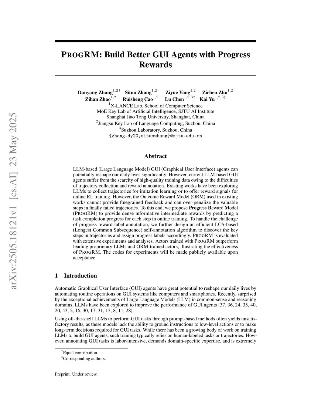 LLM-based (Large Language Model) GUI (Graphical User Interface) agents can potentially reshape our daily lives significantly. However, current LLM-based GUI agents suffer from the scarcity of high-quality training data owing to the difficulties of trajectory collection and reward annotation. Existing works have been exploring LLMs to collect trajectories for imitation learning or to offer reward signals for online RL training. However, the Outcome Reward Model (ORM) used in existing works cannot provide finegrained feedback and can over-penalize the valuable steps in finally failed trajectories. To this end, we propose Progress Reward Model (ProgRM) to provide dense informative intermediate rewards by predicting a task completion progress for each step in online training. To handle the challenge of progress reward label annotation, we further design an efficient LCS-based (Longest Common Subsequence) self-annotation algorithm to discover the key steps in trajectories and assign progress labels accordingly. ProgRM is evaluated with extensive experiments and analyses. Actors trained with ProgRM outperform leading proprietary LLMs and ORM-trained actors, illustrating the effectiveness of ProgRM. The codes for experiments will be made publicly available upon acceptance.