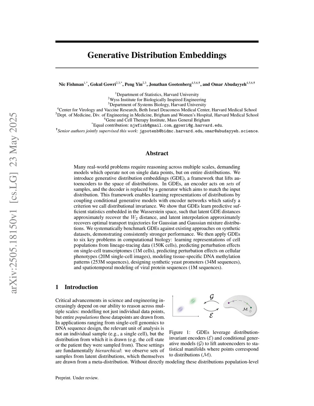 Many real-world problems require reasoning across multiple scales, demanding models which operate not on single data points, but on entire distributions. We introduce generative distribution embeddings (GDE), a framework that lifts autoencoders to the space of distributions. In GDEs, an encoder acts on sets of samples, and the decoder is replaced by a generator which aims to match the input distribution. This framework enables learning representations of distributions by coupling conditional generative models with encoder networks which satisfy a criterion we call distributional invariance. We show that GDEs learn predictive sufficient statistics embedded in the Wasserstein space, such that latent GDE distances approximately recover the distance, and latent interpolation approximately recovers optimal transport trajectories for Gaussian and Gaussian mixture distributions. We systematically benchmark GDEs against existing approaches on synthetic datasets, demonstrating consistently stronger performance. We then apply GDEs to six key problems in computational biology: learning donor-level representations from single-nuclei RNA sequencing data (6M cells), capturing clonal dynamics in lineage-traced RNA sequencing data (150K cells), predicting perturbation effects on transcriptomes (1M cells), predicting perturbation effects on cellular phenotypes (20M single-cell images), designing synthetic yeast promoters (34M sequences), and spatiotemporal modeling of viral protein sequences (1M sequences).