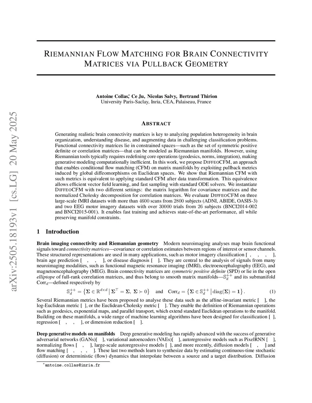 Generating realistic brain connectivity matrices is key to analyzing population heterogeneity in brain organization, understanding disease, and augmenting data in challenging classification problems. Functional connectivity matrices lie in constrained spaces, such as the set of symmetric positive definite or correlation matrices, that can be modeled as Riemannian manifolds. However, using Riemannian tools typically requires redefining core operations (geodesics, norms, integration), making generative modeling computationally inefficient. In this work, we propose DiffeoCFM, an approach that enables conditional flow matching (CFM) on matrix manifolds by exploiting pullback metrics induced by global diffeomorphisms on Euclidean spaces. We show that Riemannian CFM with such metrics is equivalent to applying standard CFM after data transformation. This equivalence allows efficient vector field learning, and fast sampling with standard ODE solvers. We instantiate DiffeoCFM with two different settings: the matrix logarithm for covariance matrices and the normalized Cholesky decomposition for correlation matrices. We evaluate DiffeoCFM on three large-scale fMRI datasets with more than 4600 scans from 2800 subjects (ADNI, ABIDE, OASIS-3) and two EEG motor imagery datasets with over 30000 trials from 26 subjects (BNCI2014-002 and BNCI2015-001). It enables fast training and achieves state-of-the-art performance, all while preserving manifold constraints. Code:this https URL