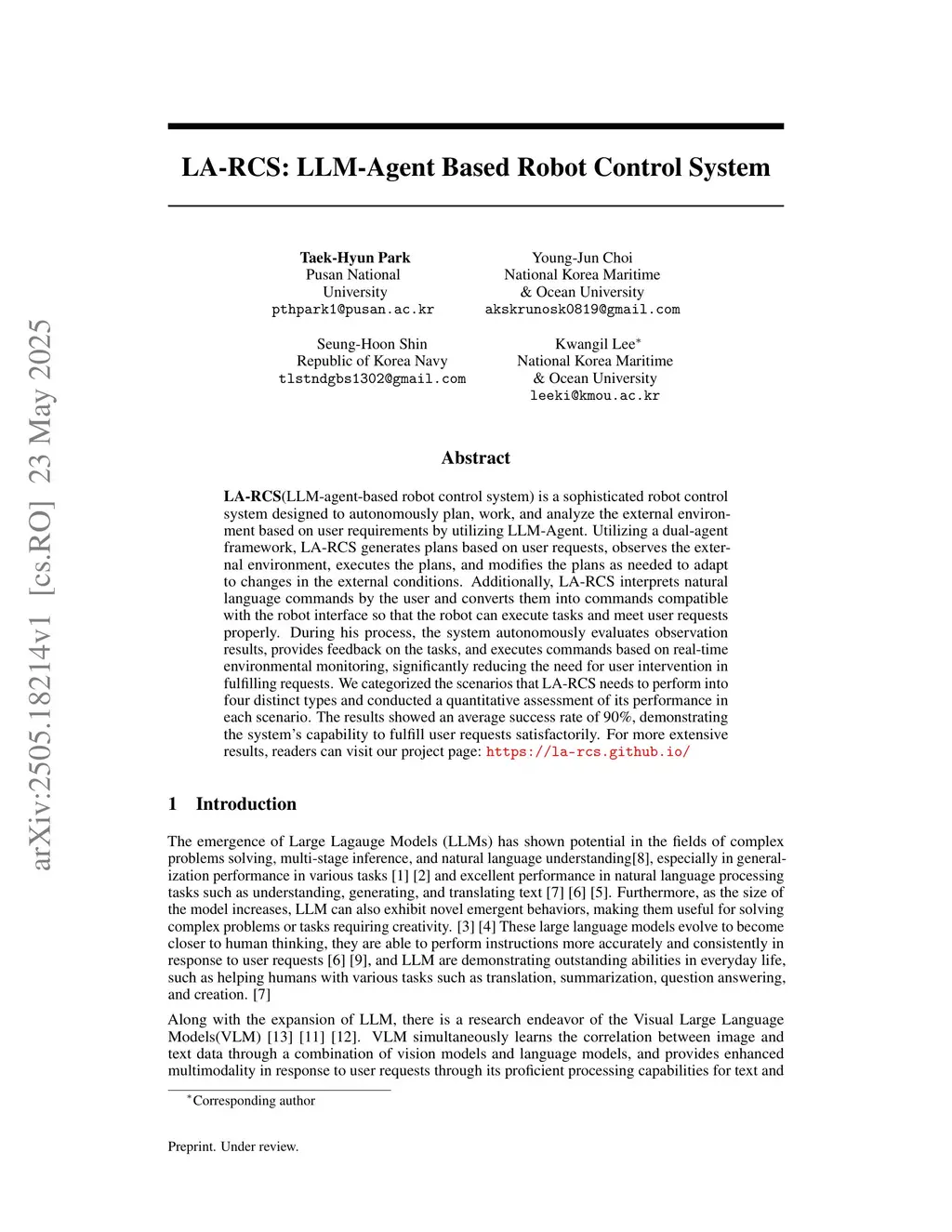 LA-RCS (LLM-agent-based robot control system) is a sophisticated robot control system designed to autonomously plan, work, and analyze the external environment based on user requirements by utilizing LLM-Agent. Utilizing a dual-agent framework, LA-RCS generates plans based on user requests, observes the external environment, executes the plans, and modifies the plans as needed to adapt to changes in the external conditions. Additionally, LA-RCS interprets natural language commands by the user and converts them into commands compatible with the robot interface so that the robot can execute tasks and meet user requests properly. During his process, the system autonomously evaluates observation results, provides feedback on the tasks, and executes commands based on real-time environmental monitoring, significantly reducing the need for user intervention in fulfilling requests. We categorized the scenarios that LA-RCS needs to perform into four distinct types and conducted a quantitative assessment of its performance in each scenario. The results showed an average success rate of 90 percent, demonstrating the system capability to fulfill user requests satisfactorily. For more extensive results, readers can visit our project page:this https URL