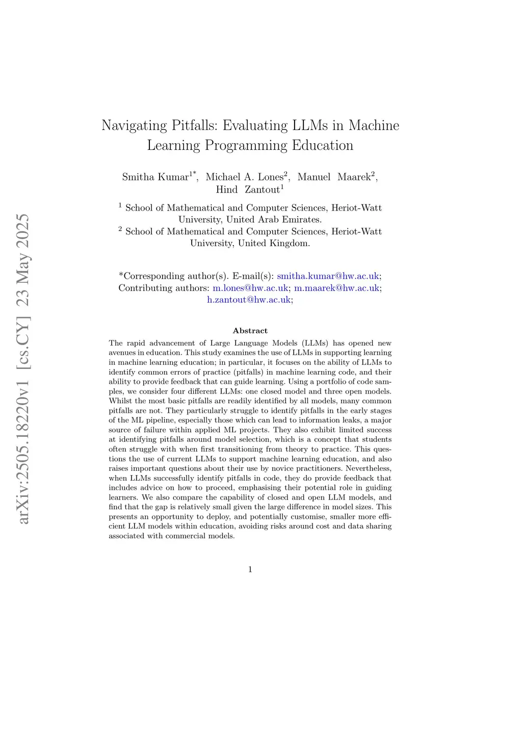 The rapid advancement of Large Language Models (LLMs) has opened new avenues in education. This study examines the use of LLMs in supporting learning in machine learning education; in particular, it focuses on the ability of LLMs to identify common errors of practice (pitfalls) in machine learning code, and their ability to provide feedback that can guide learning. Using a portfolio of code samples, we consider four different LLMs: one closed model and three open models. Whilst the most basic pitfalls are readily identified by all models, many common pitfalls are not. They particularly struggle to identify pitfalls in the early stages of the ML pipeline, especially those which can lead to information leaks, a major source of failure within applied ML projects. They also exhibit limited success at identifying pitfalls around model selection, which is a concept that students often struggle with when first transitioning from theory to practice. This questions the use of current LLMs to support machine learning education, and also raises important questions about their use by novice practitioners. Nevertheless, when LLMs successfully identify pitfalls in code, they do provide feedback that includes advice on how to proceed, emphasising their potential role in guiding learners. We also compare the capability of closed and open LLM models, and find that the gap is relatively small given the large difference in model sizes. This presents an opportunity to deploy, and potentially customise, smaller more efficient LLM models within education, avoiding risks around cost and data sharing associated with commercial models.