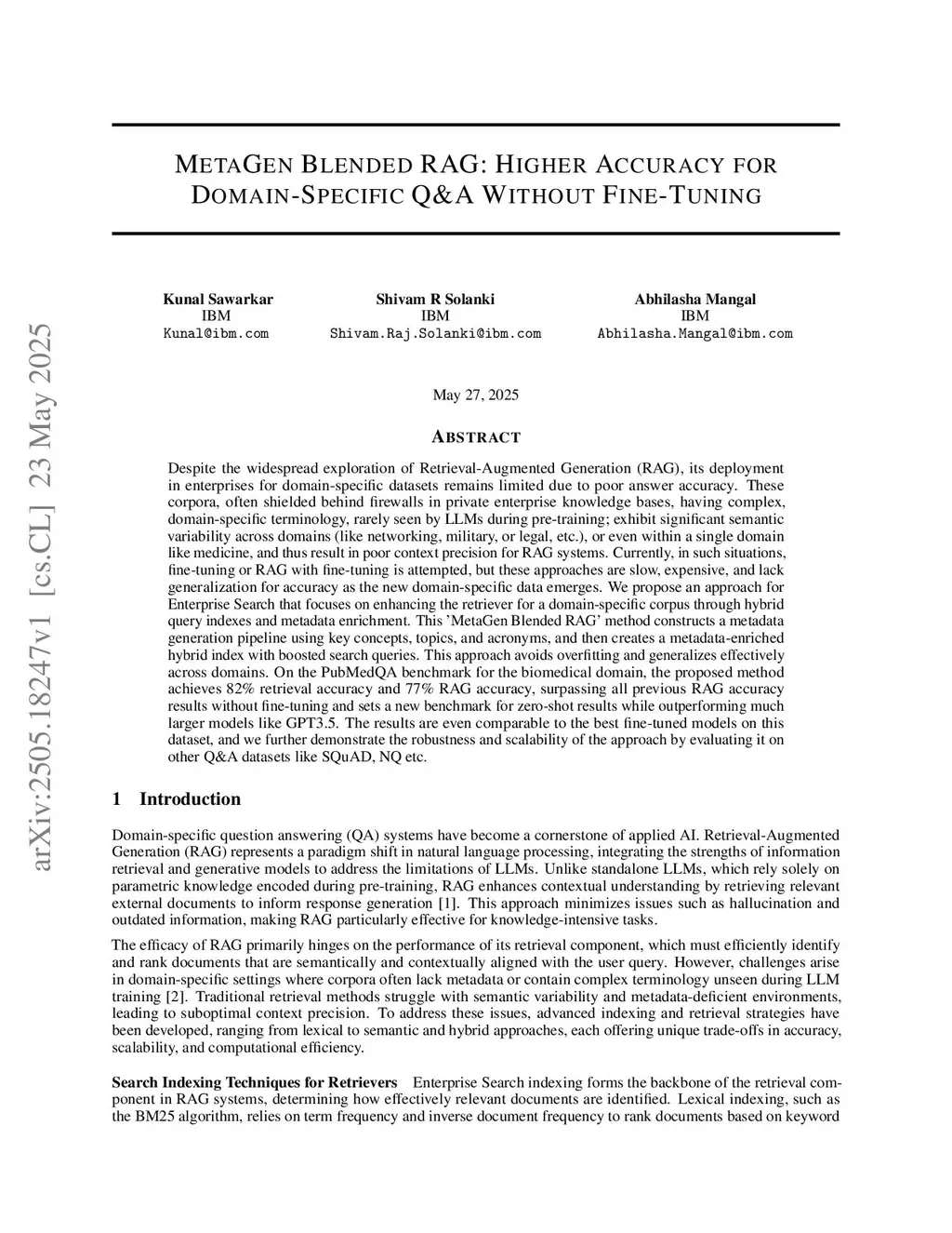 Retrieval-Augmented Generation (RAG) struggles with domain-specific enterprise datasets, often isolated behind firewalls and rich in complex, specialized terminology unseen by LLMs during pre-training. Semantic variability across domains like medicine, networking, or law hampers RAG's context precision, while fine-tuning solutions are costly, slow, and lack generalization as new data emerges. Achieving zero-shot precision with retrievers without fine-tuning still remains a key challenge. We introduce 'MetaGen Blended RAG', a novel enterprise search approach that enhances semantic retrievers through a metadata generation pipeline and hybrid query indexes using dense and sparse vectors. By leveraging key concepts, topics, and acronyms, our method creates metadata-enriched semantic indexes and boosted hybrid queries, delivering robust, scalable performance without fine-tuning. On the biomedical PubMedQA dataset, MetaGen Blended RAG achieves 82% retrieval accuracy and 77% RAG accuracy, surpassing all prior zero-shot RAG benchmarks and even rivaling fine-tuned models on that dataset, while also excelling on datasets like SQuAD and NQ. This approach redefines enterprise search using a new approach to building semantic retrievers with unmatched generalization across specialized domains.