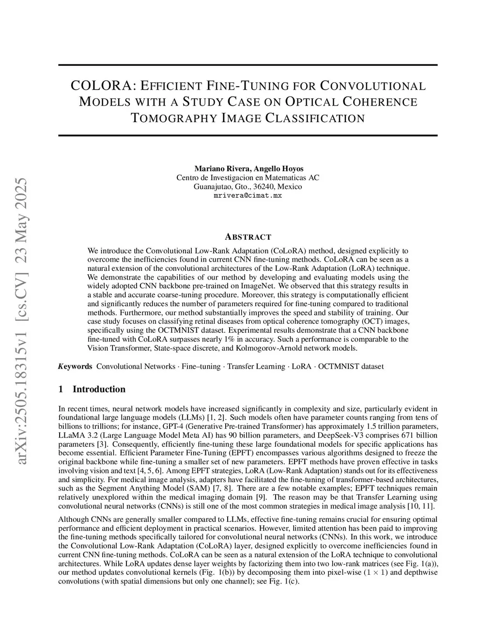 COLORA: Efficient Fine-Tuning for Convolutional Models with a Study Case on Optical Coherence Tomography Image Classification