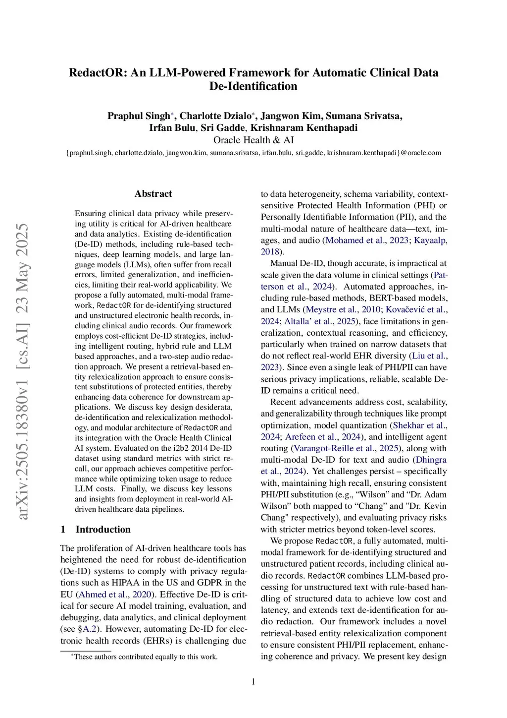 Ensuring clinical data privacy while preserving utility is critical for AI-driven healthcare and data analytics. Existing de-identification (De-ID) methods, including rule-based techniques, deep learning models, and large language models (LLMs), often suffer from recall errors, limited generalization, and inefficiencies, limiting their real-world applicability. We propose a fully automated, multi-modal framework, RedactOR for de-identifying structured and unstructured electronic health records, including clinical audio records. Our framework employs cost-efficient De-ID strategies, including intelligent routing, hybrid rule and LLM based approaches, and a two-step audio redaction approach. We present a retrieval-based entity relexicalization approach to ensure consistent substitutions of protected entities, thereby enhancing data coherence for downstream applications. We discuss key design desiderata, de-identification and relexicalization methodology, and modular architecture of RedactOR and its integration with the Oracle Health Clinical AI system. Evaluated on the i2b2 2014 De-ID dataset using standard metrics with strict recall, our approach achieves competitive performance while optimizing token usage to reduce LLM costs. Finally, we discuss key lessons and insights from deployment in real-world AI- driven healthcare data pipelines.