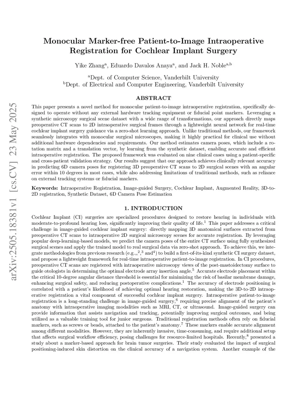 Monocular Marker-free Patient-to-Image Intraoperative Registration for Cochlear Implant Surgery