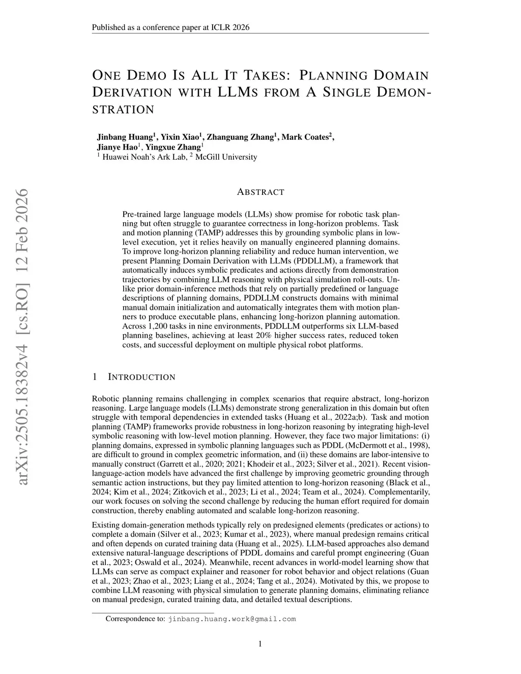 Pre-trained Large Language Models (LLMs) have shown promise in solving planning problems but often struggle to ensure plan correctness, especially for long-horizon tasks. Meanwhile, traditional robotic task and motion planning (TAMP) frameworks address these challenges more reliably by combining high-level symbolic search with low-level motion planning. At the core of TAMP is the planning domain, an abstract world representation defined through symbolic predicates and actions. However, creating these domains typically involves substantial manual effort and domain expertise, limiting generalizability. We introduce Planning Domain Derivation with LLMs (PDDLLM), a novel approach that combines simulated physical interaction with LLM reasoning to improve planning performance. The method reduces reliance on humans by inferring planning domains from a single annotated task-execution demonstration. Unlike prior domain-inference methods that rely on partially predefined or language descriptions of planning domains, PDDLLM constructs domains entirely from scratch and automatically integrates them with low-level motion planning skills, enabling fully automated long-horizon planning. PDDLLM is evaluated on over 1,200 diverse tasks spanning nine environments and benchmarked against six LLM-based planning baselines, demonstrating superior long-horizon planning performance, lower token costs, and successful deployment on multiple physical robot platforms.
